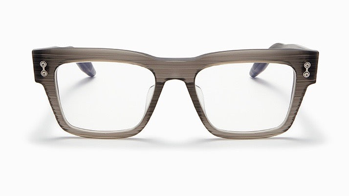 These are sophisticated square-framed prescription glasses featuring a distinctive woodgrain-textured grey acetate construction. The frames have a bold, architectural presence with thick temple arms and decorative metal pins on the front corners. The design strikes a balance between modern minimalism and professional sophistication, with clean lines and a substantial build that suggests durability and quality craftsmanship.