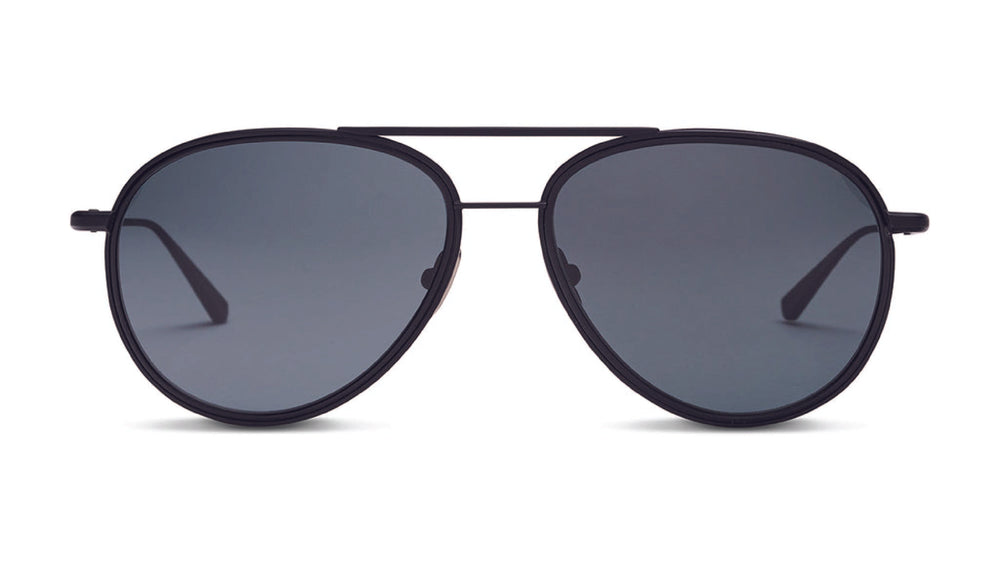 Classic black metal aviator sunglasses with a sleek double bridge design. The frame features a sophisticated matte black finish with grey-tinted lenses. The silhouette is timeless and versatile, with thin metal temple arms and adjustable nose pads for comfort. The design maintains a balanced proportion between the lenses and frame elements, creating a refined and modern interpretation of the traditional aviator style.