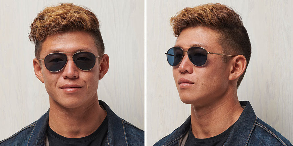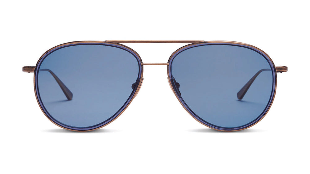 These are elegant aviator-style sunglasses featuring a refined bronze metallic frame with a blue-tinted lens. The design combines classic aviator styling with modern minimalism, showcasing a sleek double bridge and thin metal construction throughout. The frame has a subtle blue accent trim around the lenses that complements the lens tint, creating a sophisticated look. The temple arms are slim and streamlined, maintaining the overall lightweight appearance of the piece.