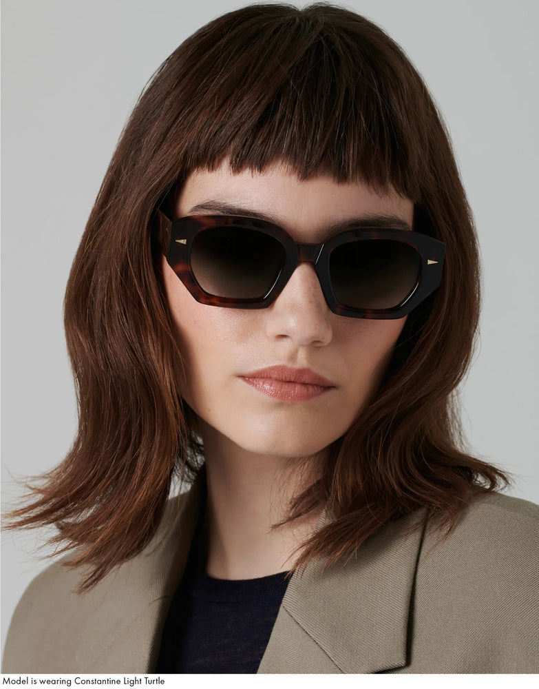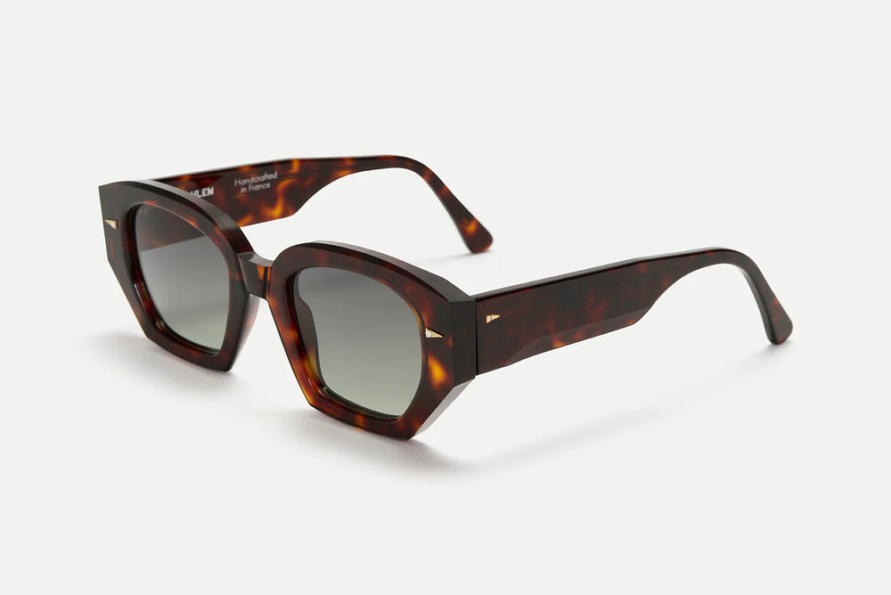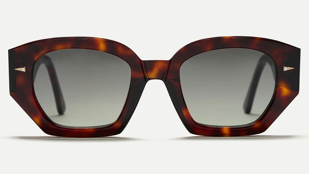 These distinctive hexagonal-shaped sunglasses feature a bold tortoiseshell acetate frame with gradient grey lenses. The design showcases a contemporary geometric silhouette with thick rims and subtle metallic accents at the temple corners. The frames have a sophisticated dark tortoise pattern that combines deep browns and amber highlights, creating a luxurious vintage-inspired aesthetic. The substantial build quality and architectural design make these sunglasses both a statement piece and a durable everyday accessory.