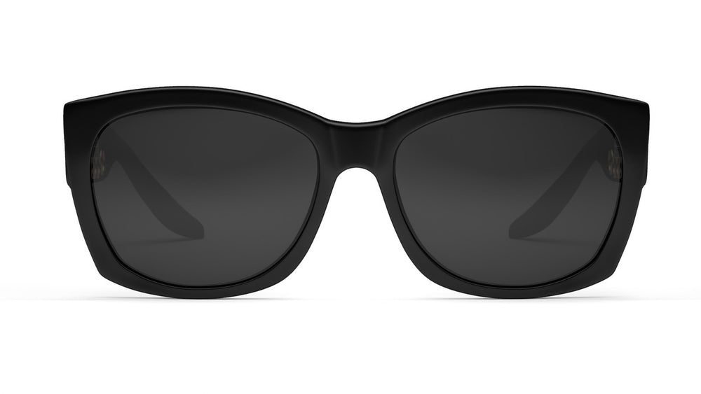 Classic oversized square sunglasses with a chunky black frame construction. Features a contemporary minimalist design with clean lines and a substantial frame presence. The dark lenses and all-black colorway create a sophisticated, timeless look suitable for any occasion. The wide temple arms provide good coverage and sun protection, while the saddle bridge offers comfortable fit. The design strikes a balance between fashion-forward and understated elegance.