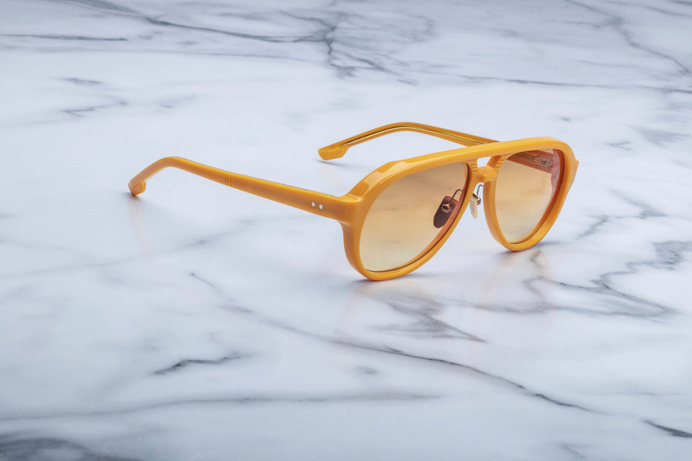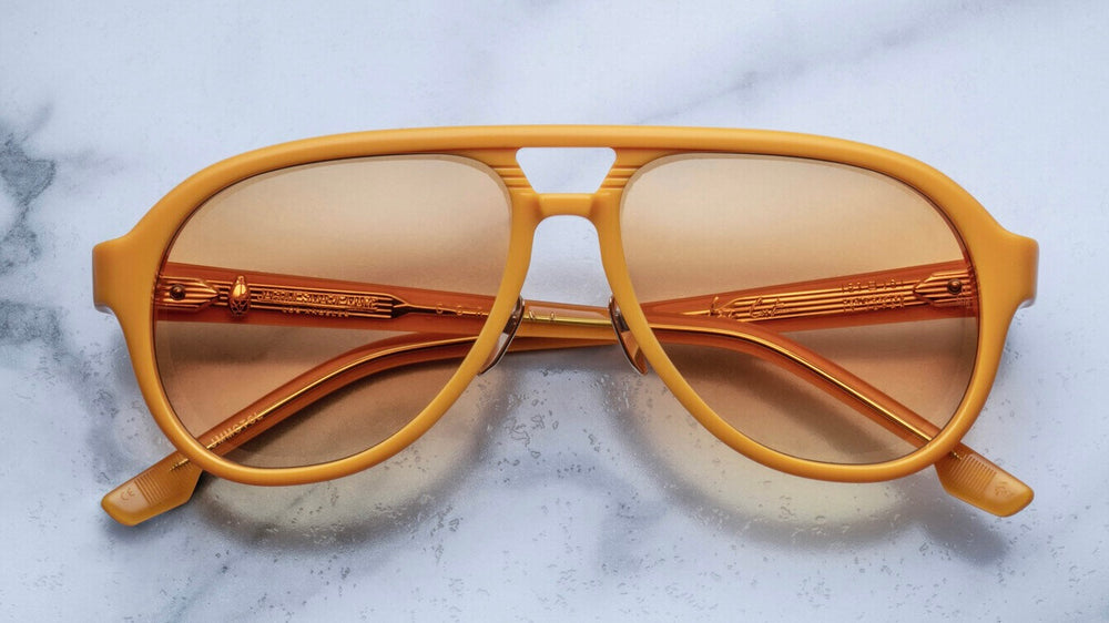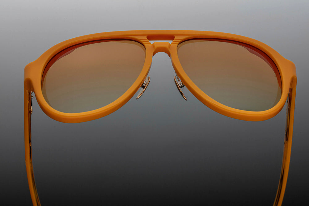A sophisticated retro-inspired aviator frame in a striking matte golden-orange colorway. The sunglasses feature a distinctive double-bridge silhouette with clean lines and vintage-inspired detailing. The frame has a luxurious matte finish with complementary gradient lenses. The temple arms showcase subtle branding and decorative elements. The overall design balances classic aviator styling with contemporary sophistication, making it suitable for fashion-forward individuals.