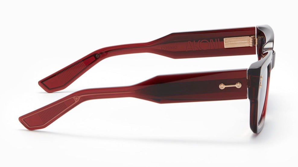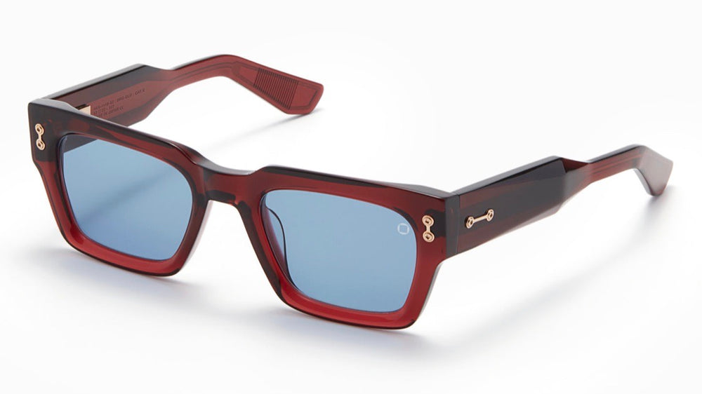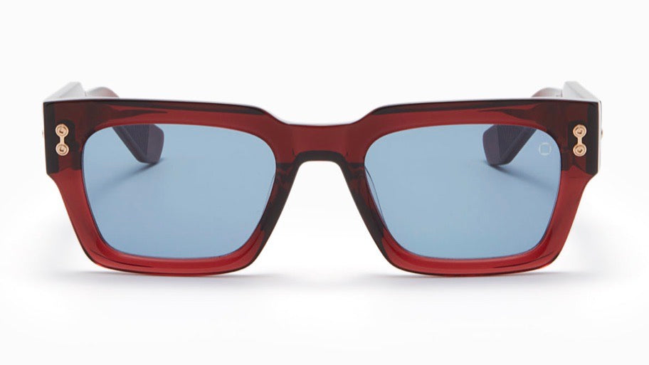 These are bold statement sunglasses featuring a thick burgundy-red translucent plastic frame with a chunky square silhouette. The frame has subtle gold hardware accents on the temples. The lenses are a cool light blue tint. The design has a contemporary geometric aesthetic with clean lines and a substantial presence, making them suitable for any face shape. The red gradient effect on the frame gives them a sophisticated, premium look.