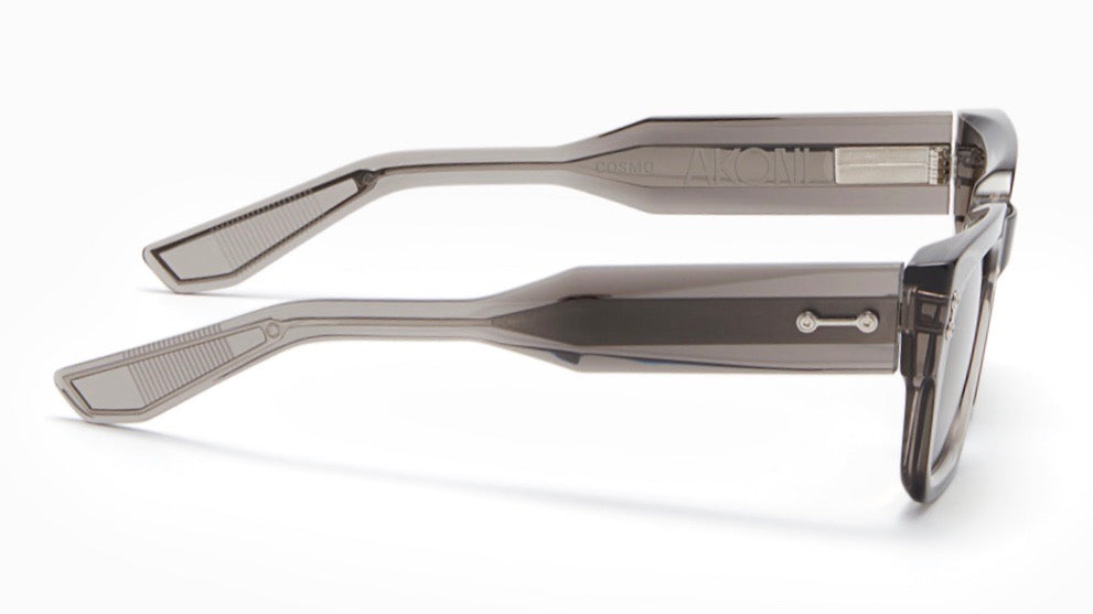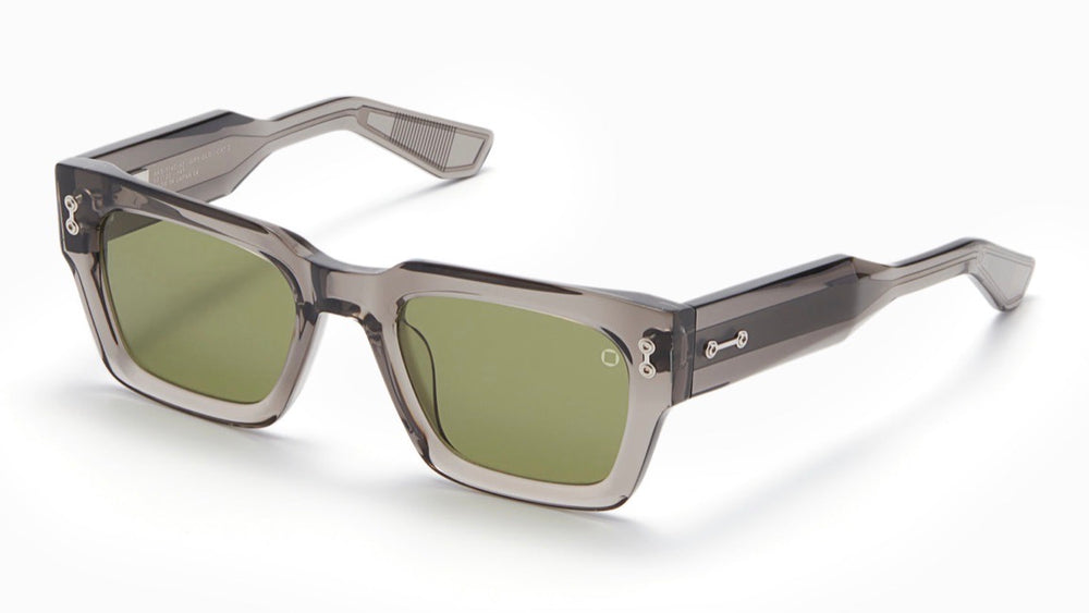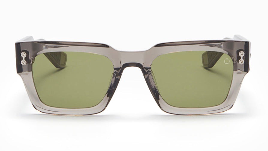 These are bold, fashion-forward sunglasses featuring a chunky transparent grey acetate frame with a distinctive geometric square shape. The lenses are a solid olive green color, creating an interesting contrast with the translucent frame. The design incorporates architectural elements with strong angular lines and decorative metal hardware details on the temples. The substantial frame construction gives these sunglasses a luxury, avant-garde aesthetic that would appeal to fashion-conscious individuals seeking a contemporary statement piece.