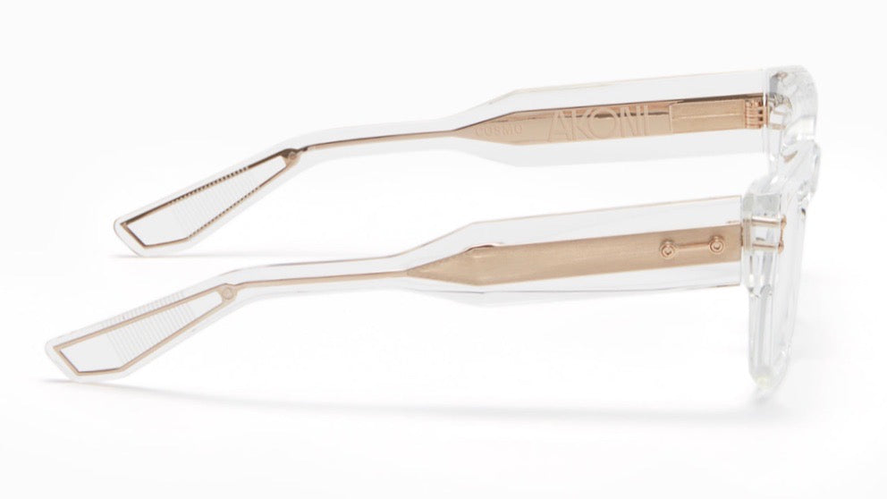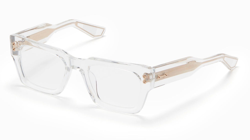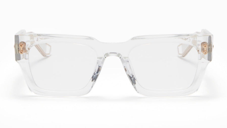 Modern minimalist transparent/clear acetate frames with a bold geometric square shape. The chunky architectural design features clean lines and a distinctive transparent frame construction that gives a contemporary, avant-garde look. Small metallic gold accents on the temple hinges add a subtle luxurious detail. The substantial build quality and crystal-clear material create an artistic statement piece while maintaining versatility.