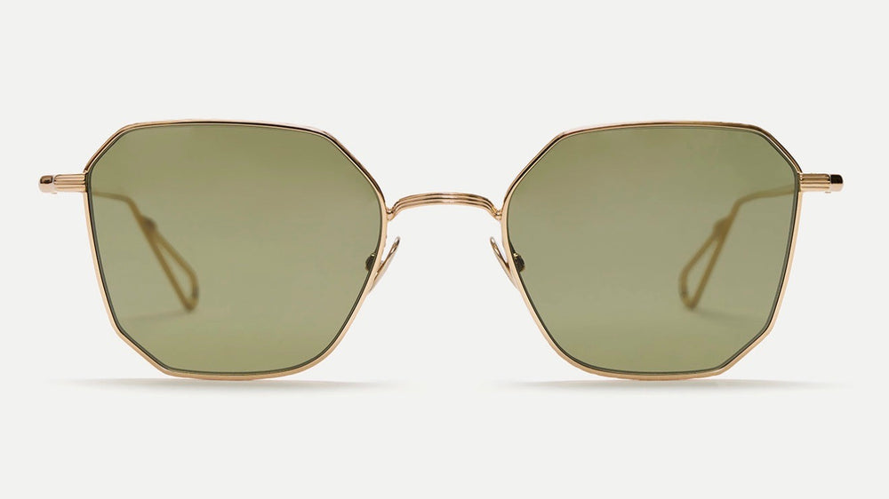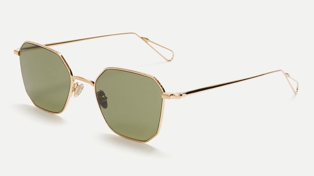 Sophisticated hexagonal sunglasses with a delicate gold metal frame and green-tinted lenses. The design features clean geometric lines with angular corners, creating a modern yet timeless aesthetic. The thin metal construction gives these sunglasses a lightweight and refined appearance, while the balanced proportions suit a variety of face shapes. The nose pads and temple arms maintain the sleek gold finish throughout, creating a cohesive luxury eyewear piece that bridges classic and contemporary design elements.