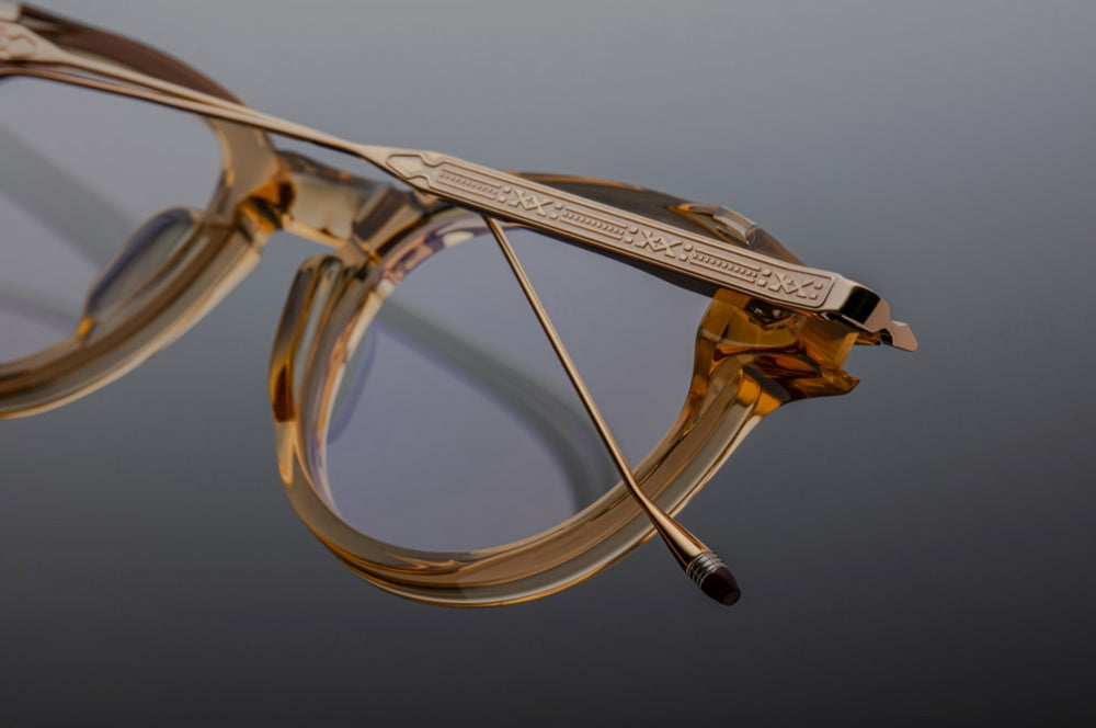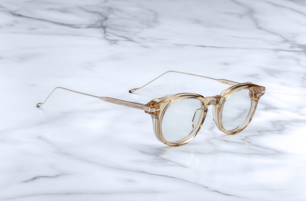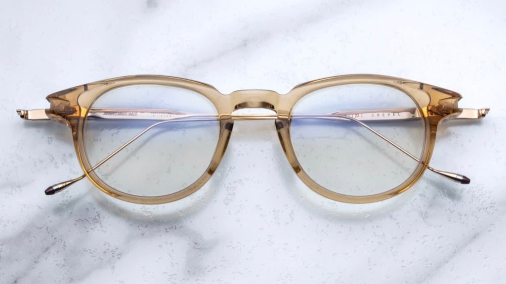 A sophisticated pair of round-framed glasses featuring a translucent champagne/bronze colored acetate frame with elegant gold-toned metal temple arms. The design showcases a classic P3 silhouette with a refined saddle bridge. The frames have a medium build with subtle vintage-inspired details, while maintaining a clean, modern aesthetic. The construction demonstrates exceptional craftsmanship with seamless integration between the acetate front and metal temples.