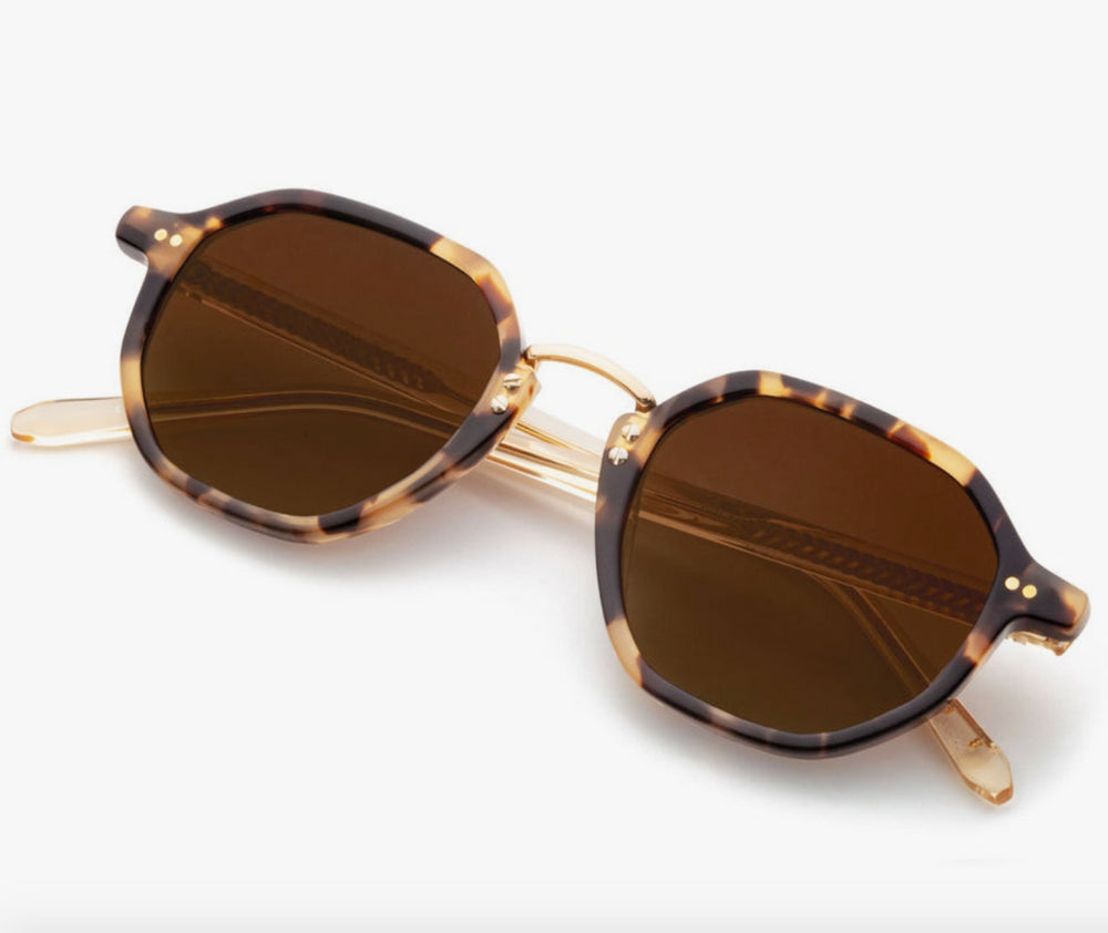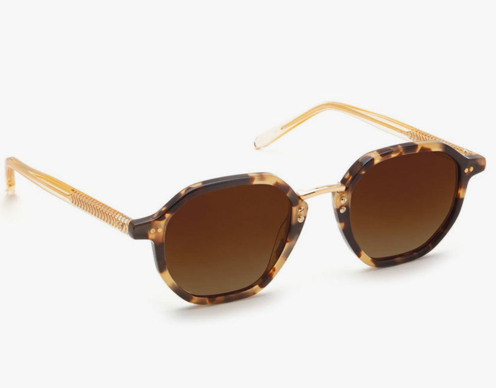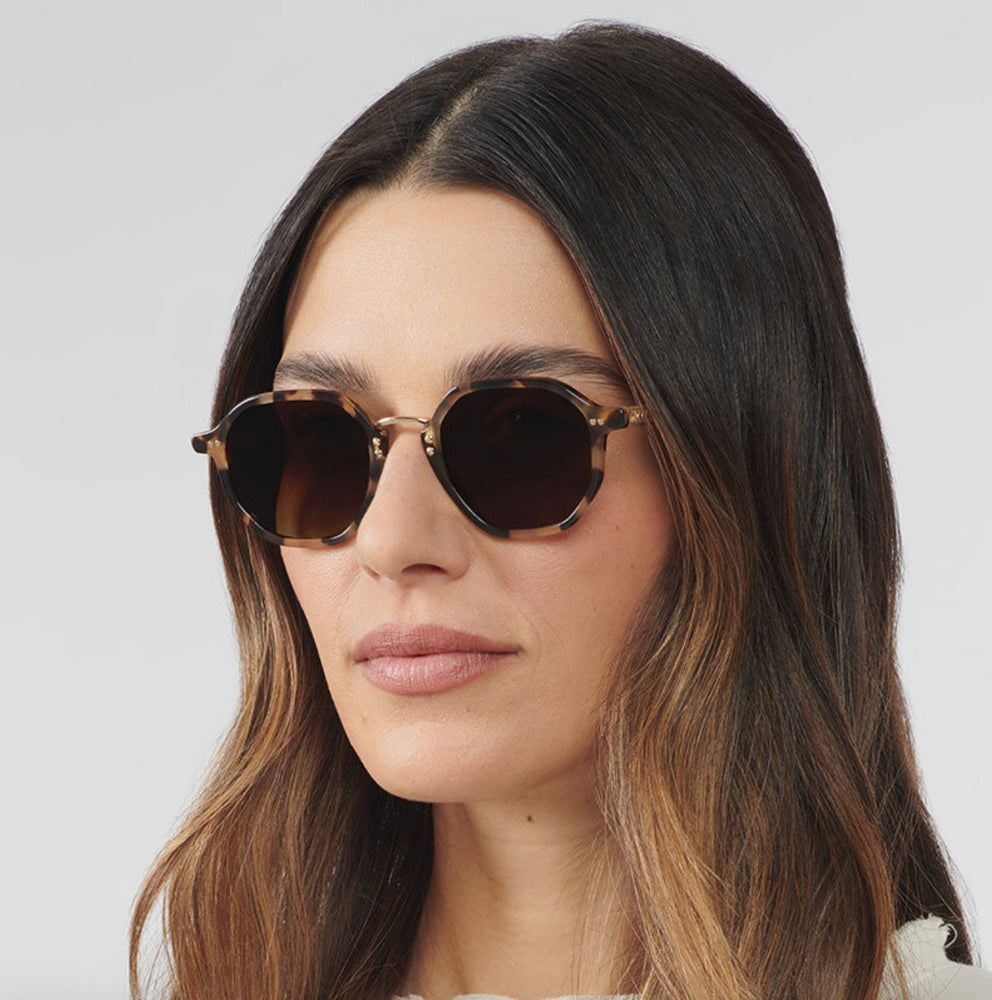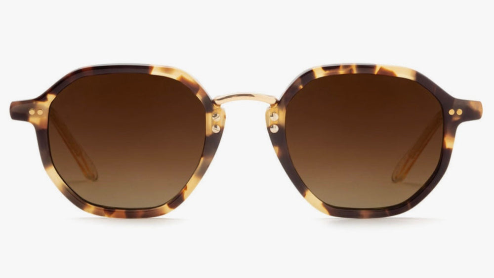 Stylish geometric sunglasses featuring a tortoiseshell acetate frame with subtle gold metal accents. The design showcases a distinctive geometric silhouette with rounded edges and a contemporary interpretation of classic eyewear. The gradient brown lenses complement the warm tortoise pattern, while delicate gold bridge and temple details add sophistication. The frames exhibit excellent craftsmanship with smooth transitions between materials and a balanced proportion that works well for various face shapes.