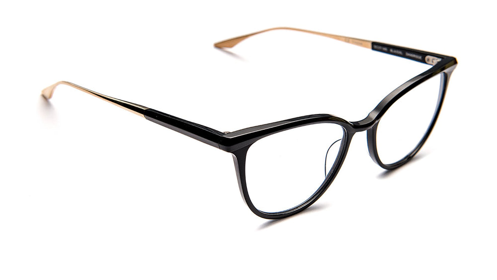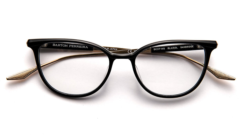 A sophisticated pair of Barton Perreira Dandridge eyeglasses featuring a sleek oval frame in black acetate with subtle cat-eye influences. The frame is complemented by elegant gold-toned metal temple arms with a textured pattern. The design showcases Japanese craftsmanship with a modern interpretation of classic eyewear styling. The thin profile and balanced proportions make these glasses both fashionable and versatile for everyday wear.