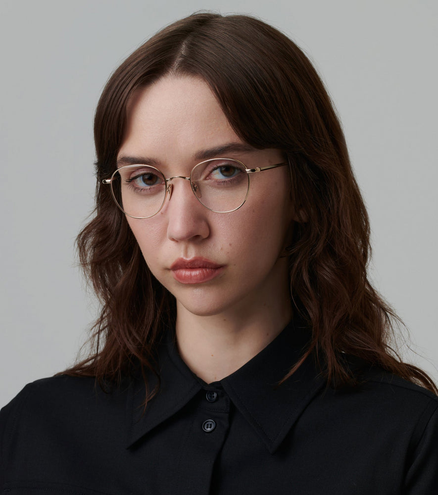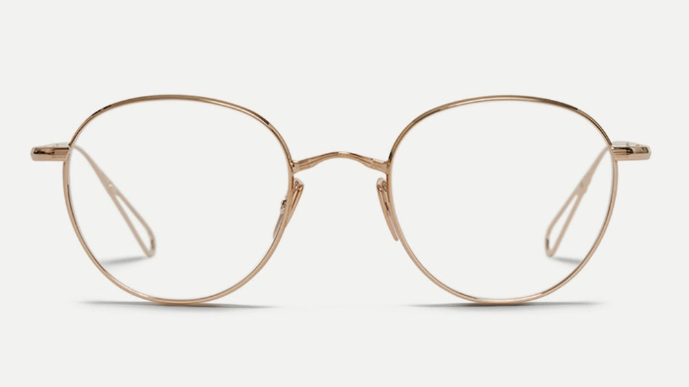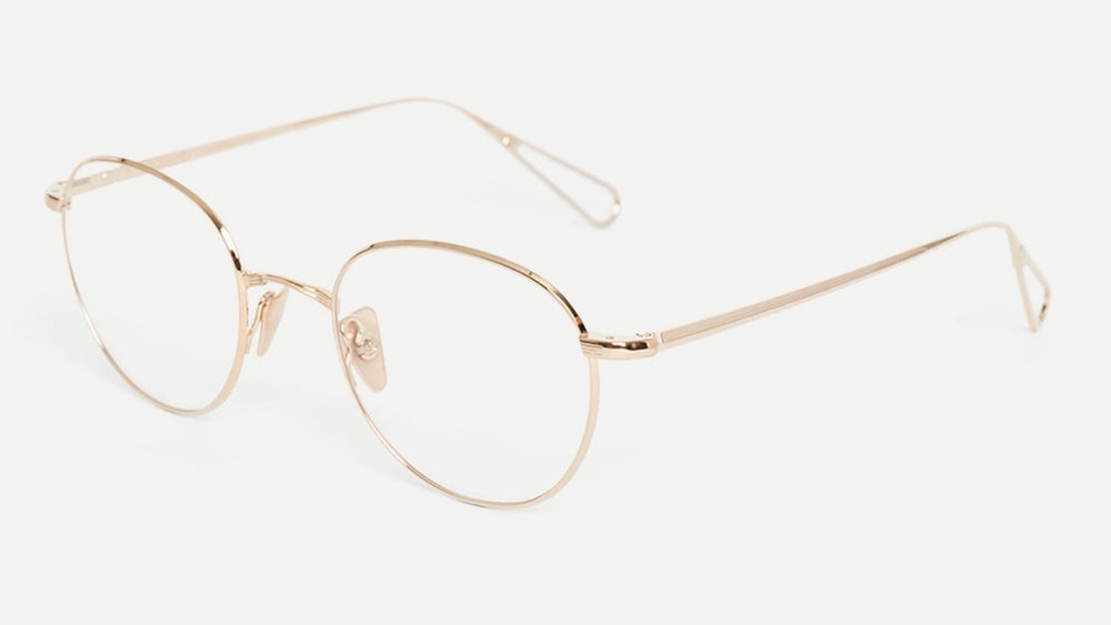 Elegant round glasses with a delicate rose gold/bronze metallic finish throughout. The frames feature a minimalist design with thin rims and arms, creating a sophisticated and timeless look. The rounded lenses are perfectly symmetrical, and the overall construction appears lightweight yet durable. The nose pads are adjustable for comfort, and the temple arms have a sleek, straight design that complements the circular front frame.