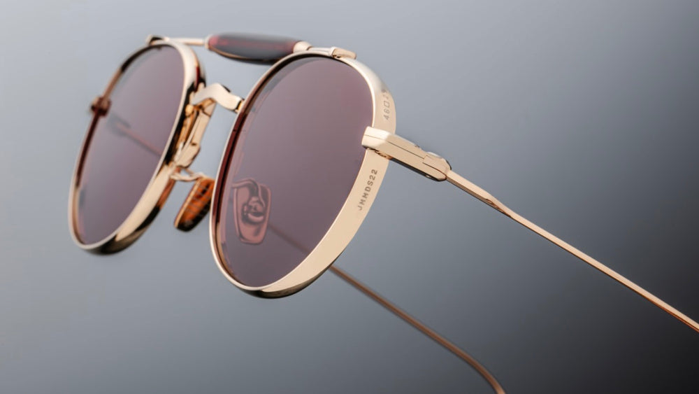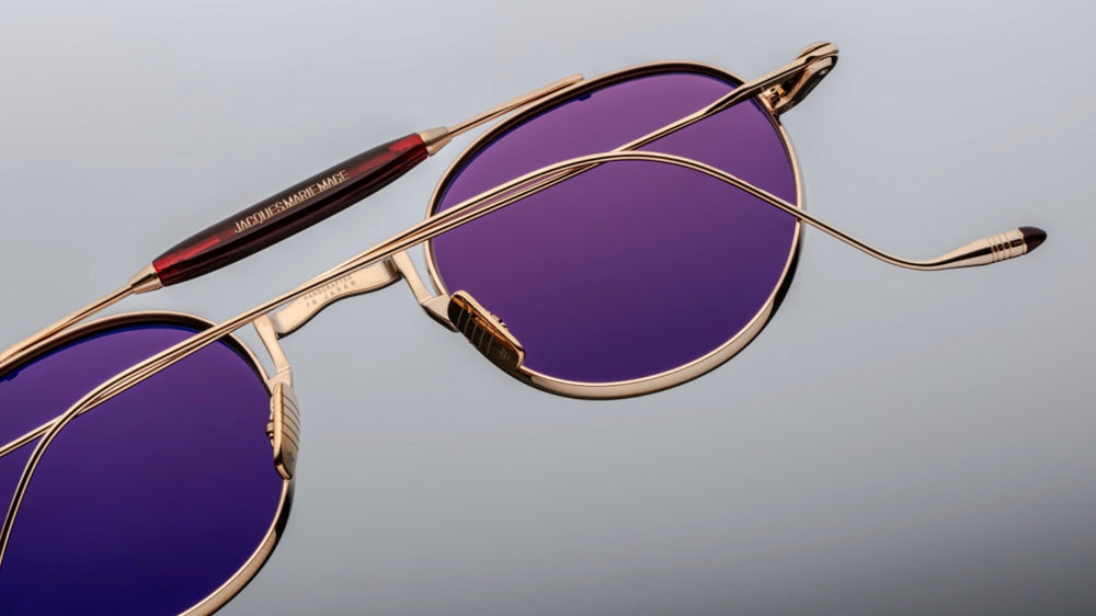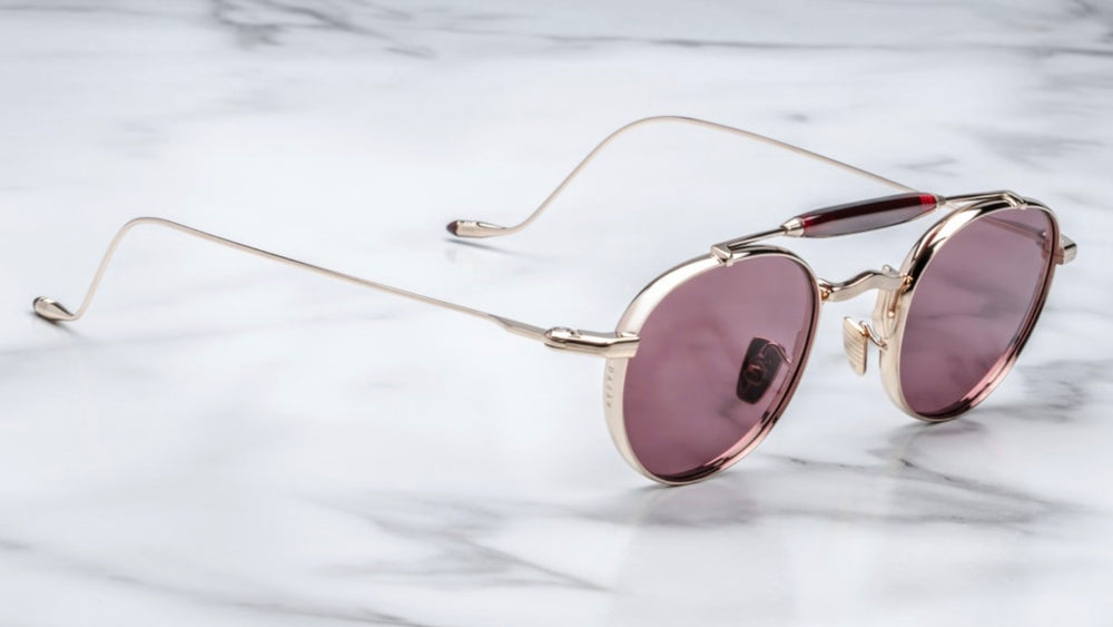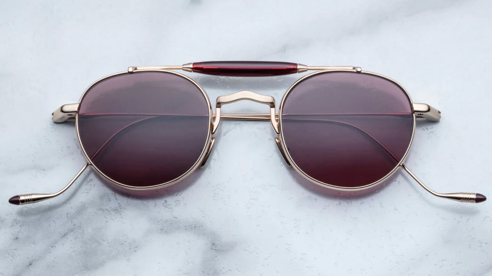 A sophisticated pair of round-framed sunglasses with a luxurious gold-toned metal construction. The design features a distinctive burgundy accent bar at the top bridge, complemented by purple-tinted lenses. The frame exhibits exceptional craftsmanship with delicate wire temple arms and adjustable nose pads for comfort. The overall aesthetic is vintage-inspired yet thoroughly modern, with subtle curvature and balanced proportions that would suit a variety of face shapes. The sunglasses demonstrate premium quality with their precise engineering and refined finish.