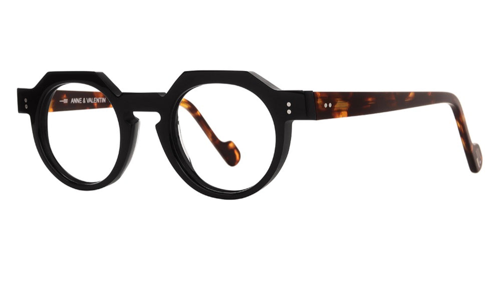 These distinctive round frames feature a bold geometric interpretation with angular edges, creating an intellectual yet avant-garde aesthetic. The front is crafted from solid black acetate with a substantial thickness, while the temple arms transition beautifully into a warm tortoise pattern. The design incorporates subtle studs at the hinges and maintains the signature Anne et Valentin artistic approach to eyewear. The substantial saddle bridge adds character while ensuring comfort and stability.