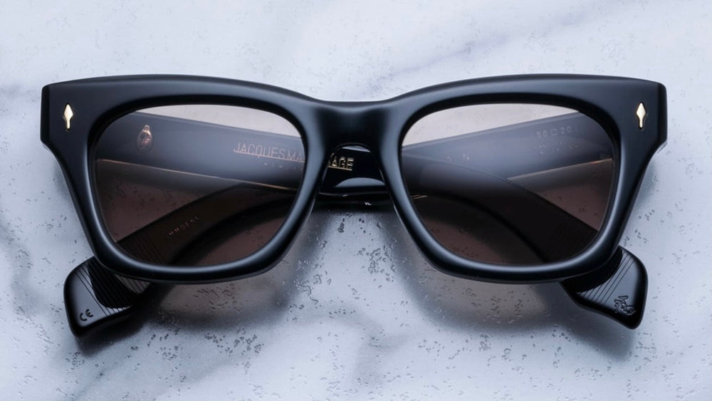 The Jacques Marie Mage DEALAN features a bold, sophisticated square silhouette with substantial acetate construction. The frame exhibits a matte black finish with a luxurious heavyweight presence typical of high-end eyewear. The design incorporates distinctive diamond-shaped metal accents on the front corners. The gradient brown lenses complement the frames dramatic proportions, creating a refined vintage-inspired aesthetic. The temple arms maintain the substantial profile while tapering elegantly toward the tips.