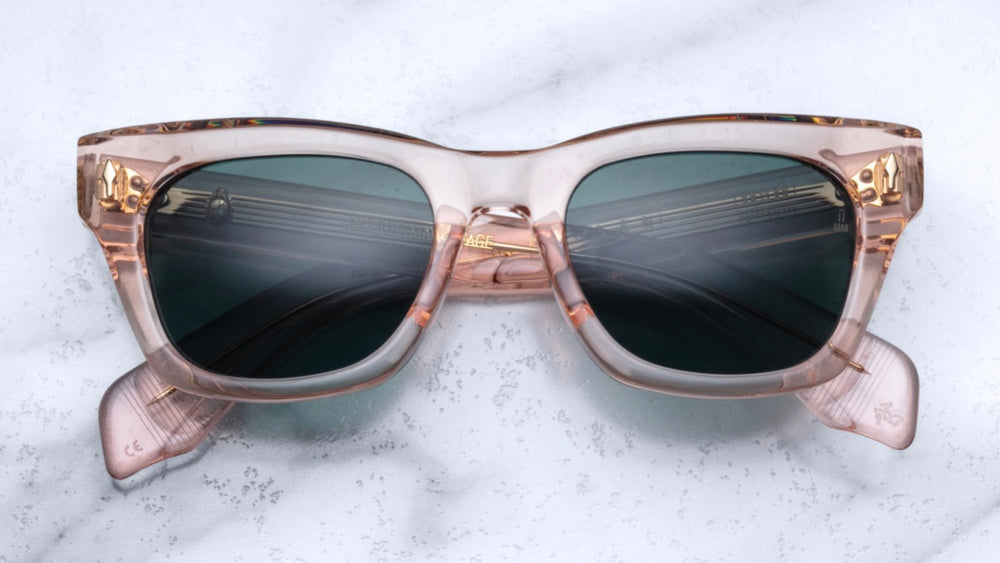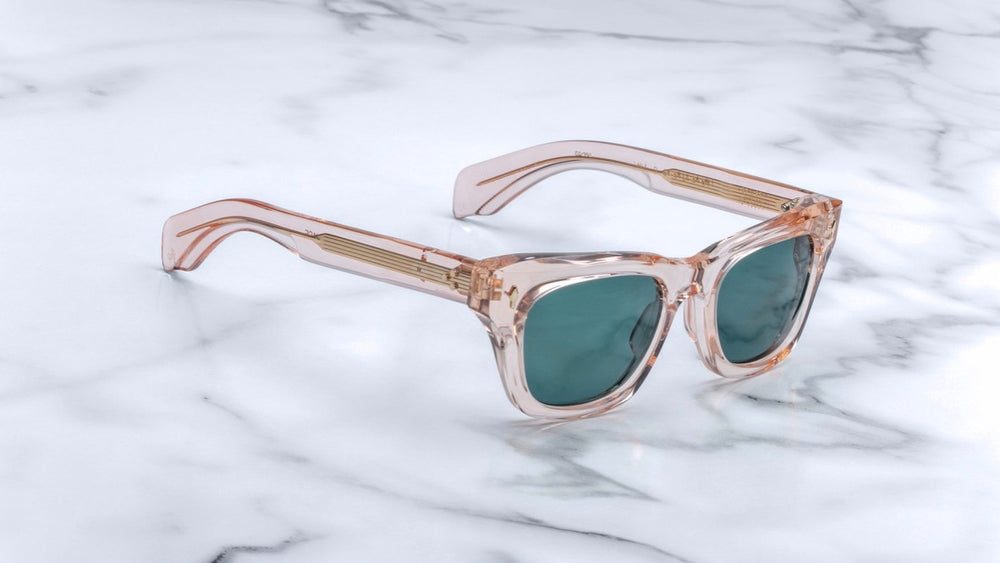 A luxurious oversized wayfarer-style frame in translucent rose crystal acetate with bold geometric angles and distinctive temple hardware in gold-tone metal accents. The frame features substantial thickness and architectural design elements that create a sophisticated, vintage-inspired aesthetic. The dark grey lenses provide excellent contrast against the soft pink frame coloring. The design showcases impeccable attention to detail with its refined construction and premium finishing.