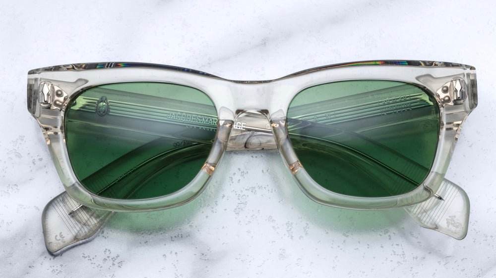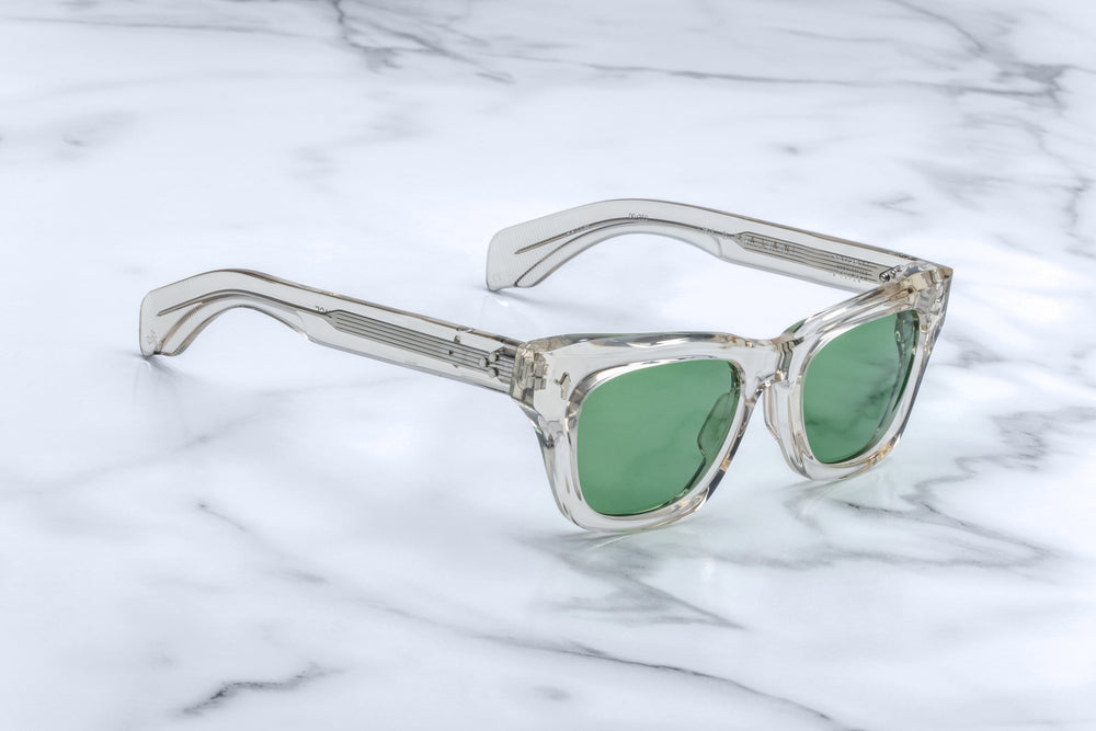 These are luxurious, oversized square sunglasses with a translucent grey crystal acetate frame. The thick, bold frame design features green-tinted lenses and has a vintage-inspired aesthetic with clean, architectural lines. The frame has a sophisticated transparent finish that gives it a modern, high-end appeal while maintaining a classic silhouette. The construction appears robust and premium, with well-defined edges and smooth contouring typical of high-end eyewear craftsmanship.