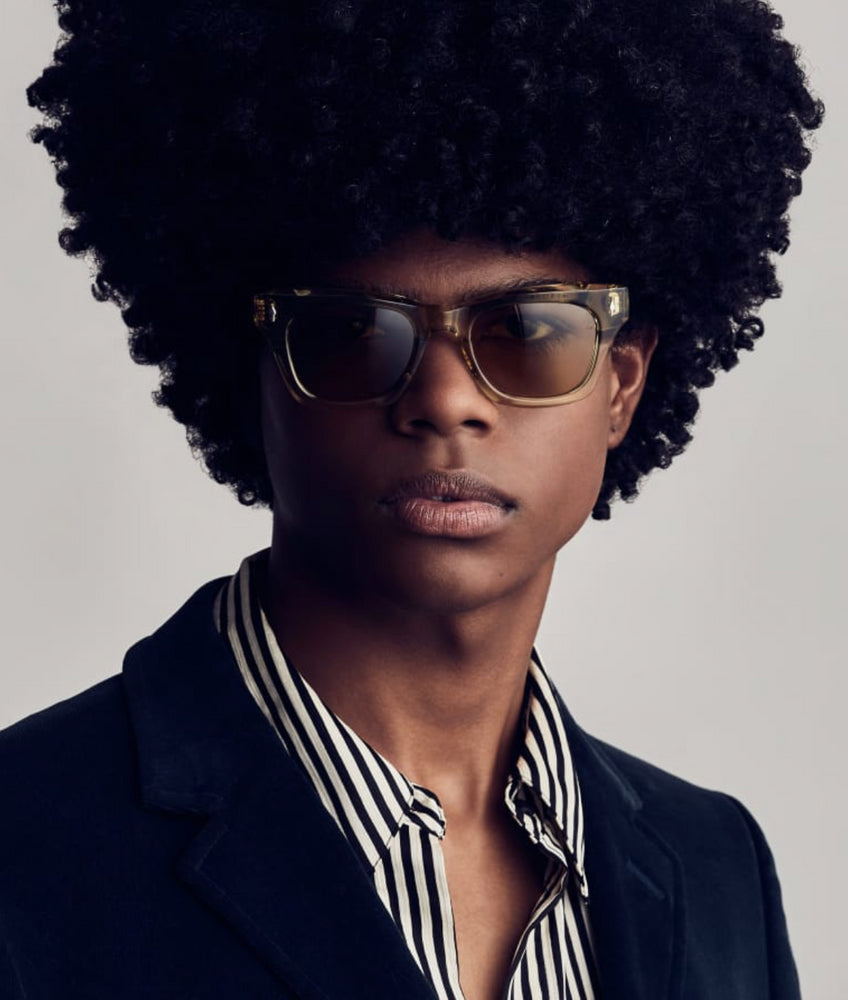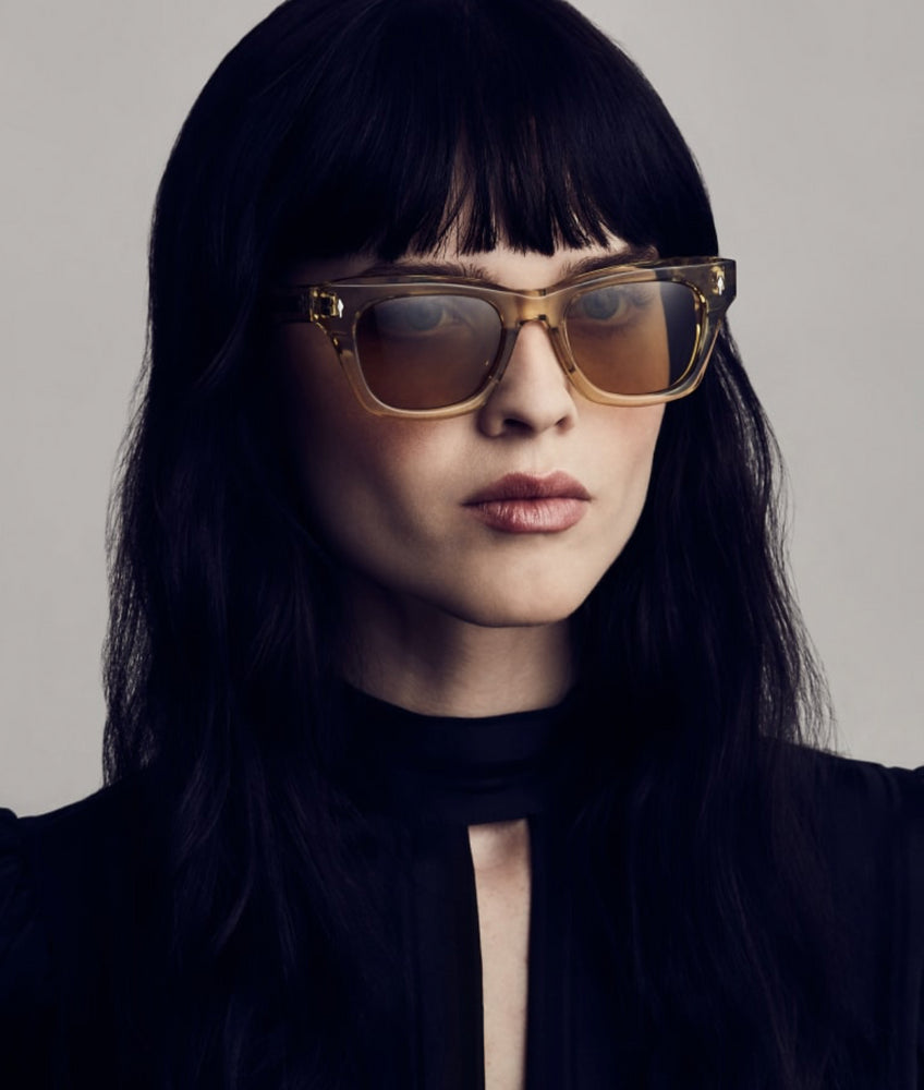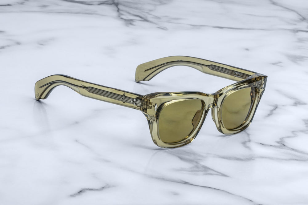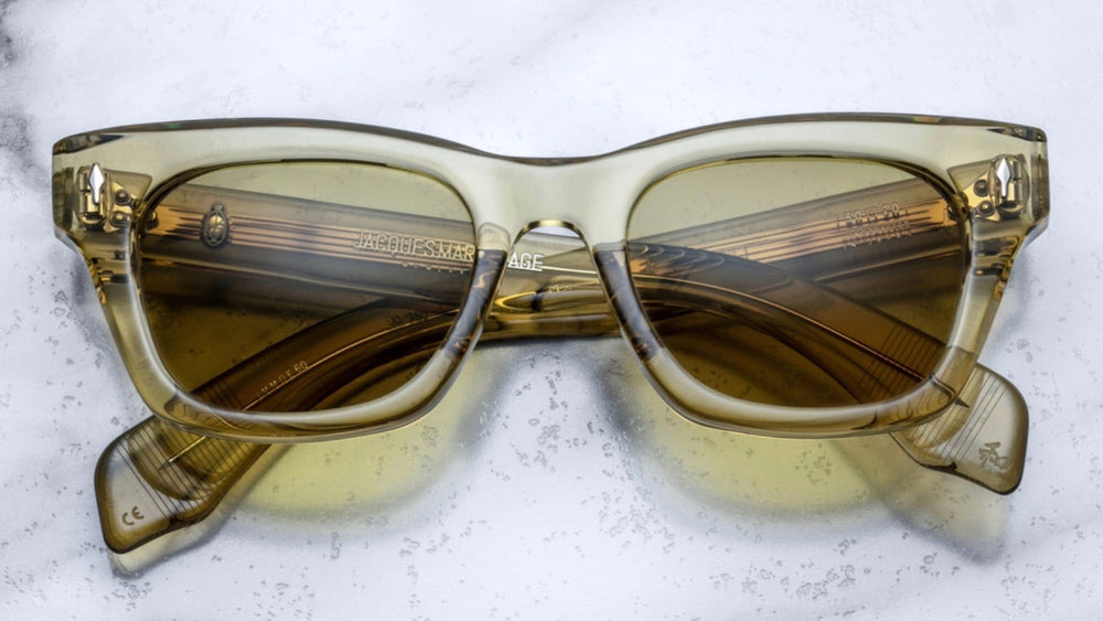 A sophisticated pair of transparent yellow-tinted acetate sunglasses by Jacques Marie Mage. The frames feature a bold, architectural rectangular silhouette with substantial thickness, giving them a refined vintage aesthetic. The lenses are a warm brown tint that complements the translucent yellow frame color. The design shows attention to detail with clean lines and subtle branding on the temple. The substantial construction suggests premium quality and durability, while maintaining an elegant, timeless appearance suitable for various face shapes.
