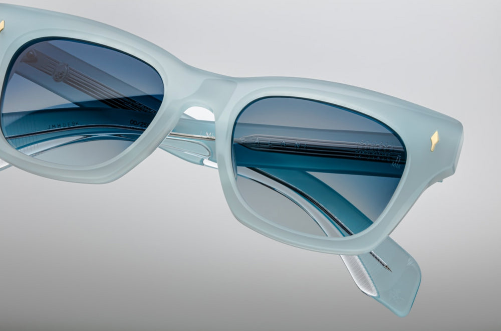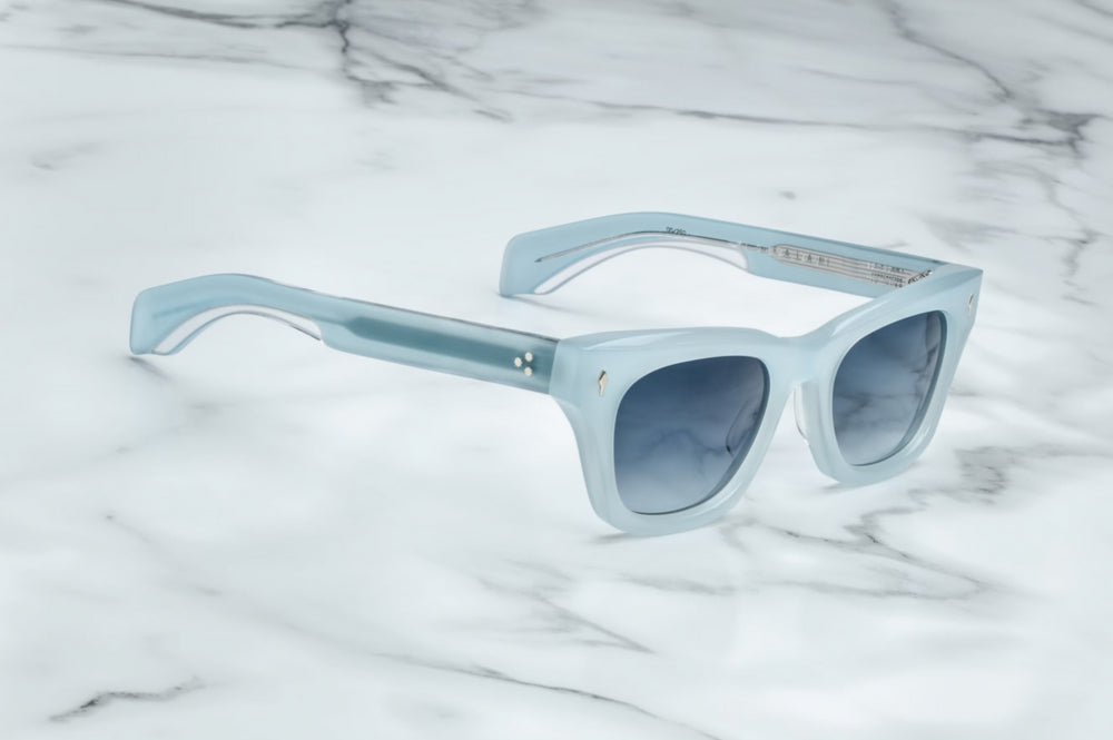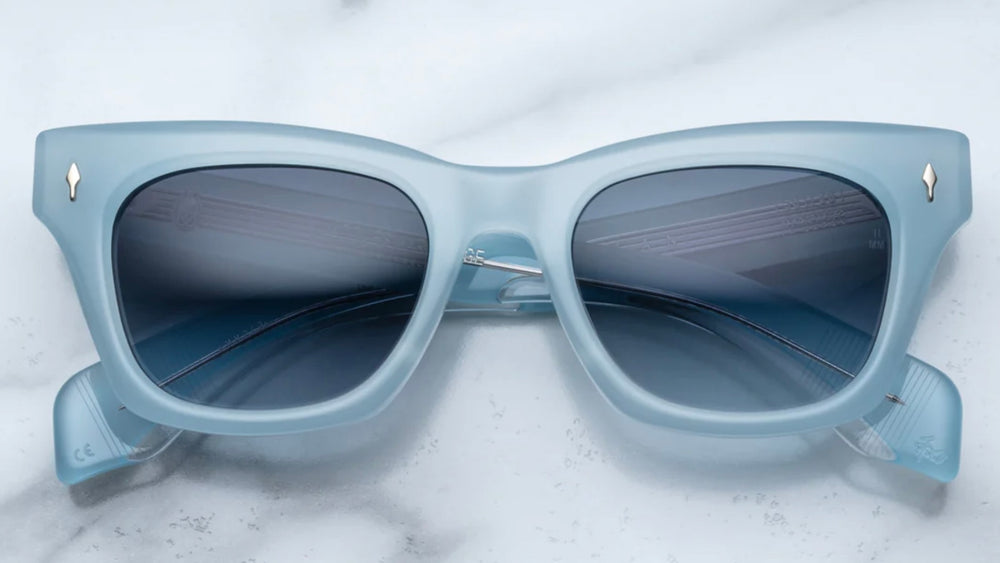 A sophisticated pair of chunky acetate sunglasses in a cool powder blue colorway. The frame features a bold rectangular silhouette with pronounced angles and a substantial build. Small diamond-shaped silver accents adorn both temples near the front. The gradient blue lenses complement the matte finish of the frame perfectly. The design exhibits a vintage-inspired aesthetic with modern refinements, characteristic of luxury eyewear. The thick temples and pronounced bridge create a statement look thats both classic and contemporary.