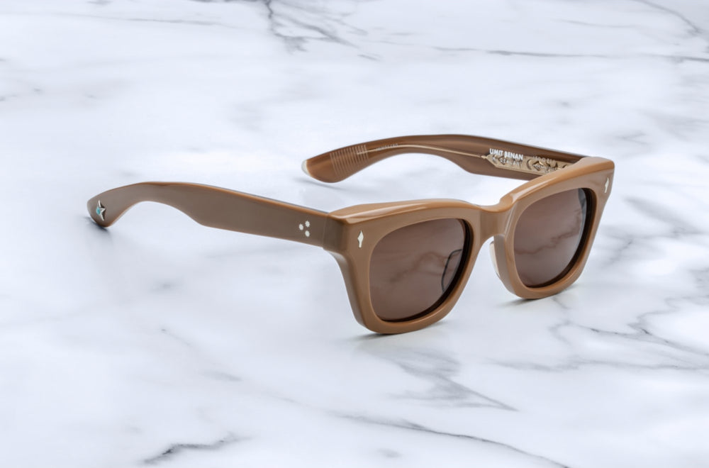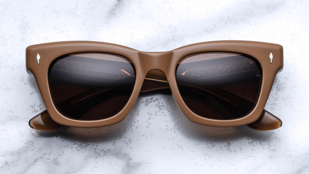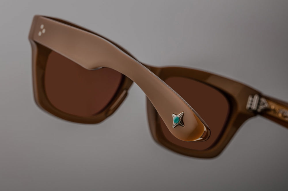 A sophisticated pair of oversized square sunglasses in a matte mocha brown colorway. The frames feature a bold, architectural design with thick acetate construction and prominent angles. Small diamond-shaped metal accents on the front corners add a subtle decorative touch. The sunglasses have a contemporary yet timeless aesthetic with substantial temple arms that match the front frame color. The dark tinted lenses complement the frames earthy tone while providing full UV protection.
