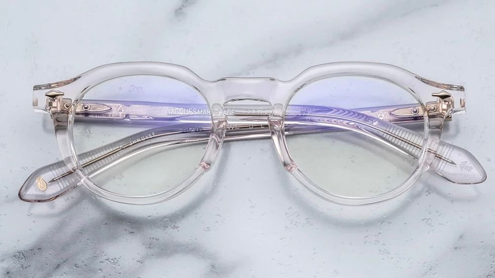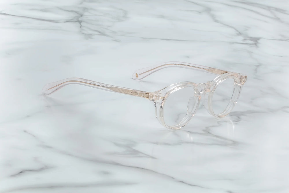 Elegant transparent crystal round frames with a sophisticated vintage-inspired design. The frame features a translucent grey acetate construction with subtle feminine curves yet maintains a unisex appeal. The clean lines and minimalist aesthetic give these glasses a modern yet timeless look. The frame appears to be well-balanced with medium thickness throughout and smooth finishing on all edges. Notable for its crystal-clear appearance that adds a lightweight and sophisticated feel to the overall design.