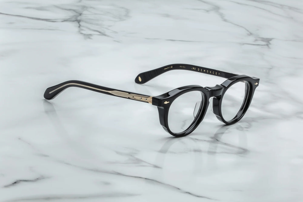 A sophisticated round-framed optical design from Jacques Marie Mage featuring a bold black acetate frame with subtle purple temple accents. The glasses showcase classic styling with gold-toned hardware details at the temples. The thick, substantial frame construction gives a strong vintage-inspired presence while maintaining refined proportions. The saddle bridge and rounded lenses create a balanced, intellectual look suitable for multiple face shapes.