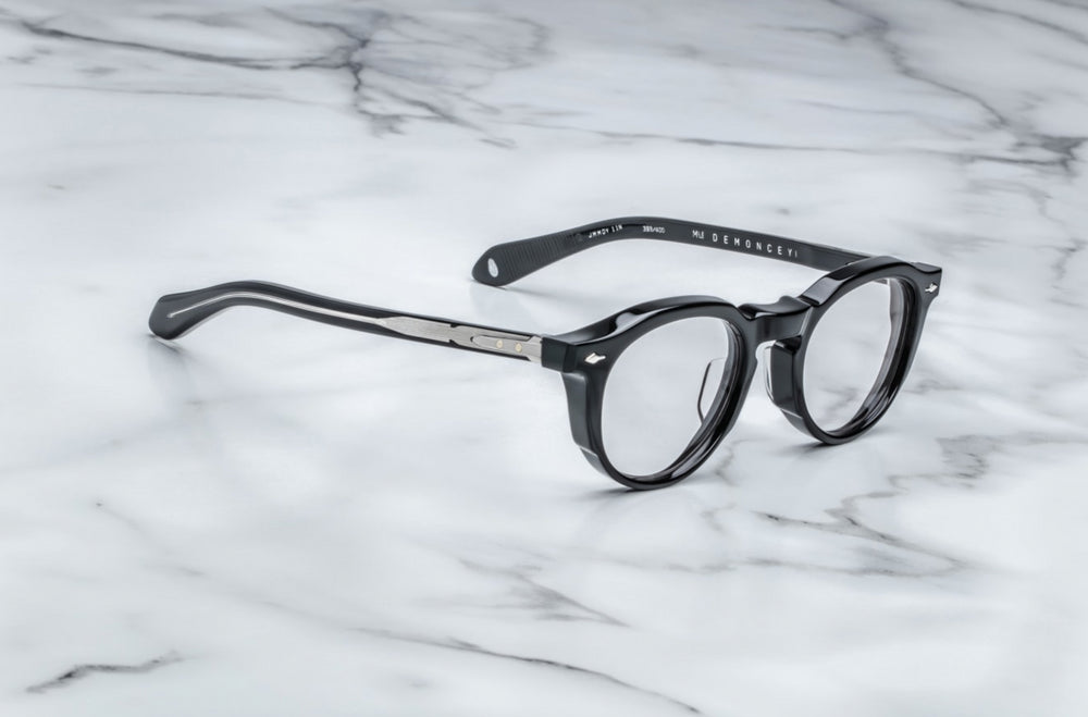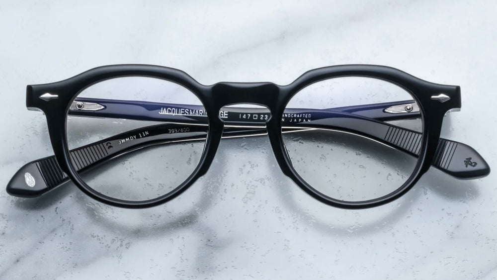 The Jacques Marie Mage DEMONCEY features a sophisticated round frame design with a bold, thick acetate construction. The frame exhibits classic styling with distinctive diamond-shaped rivets on the front corners. The temples show detailed branding and feature subtle linear texturing. These handcrafted Japanese frames demonstrate exceptional quality with their robust build and refined finish. The glasses maintain a timeless aesthetic while incorporating subtle luxury details that elevate their design.