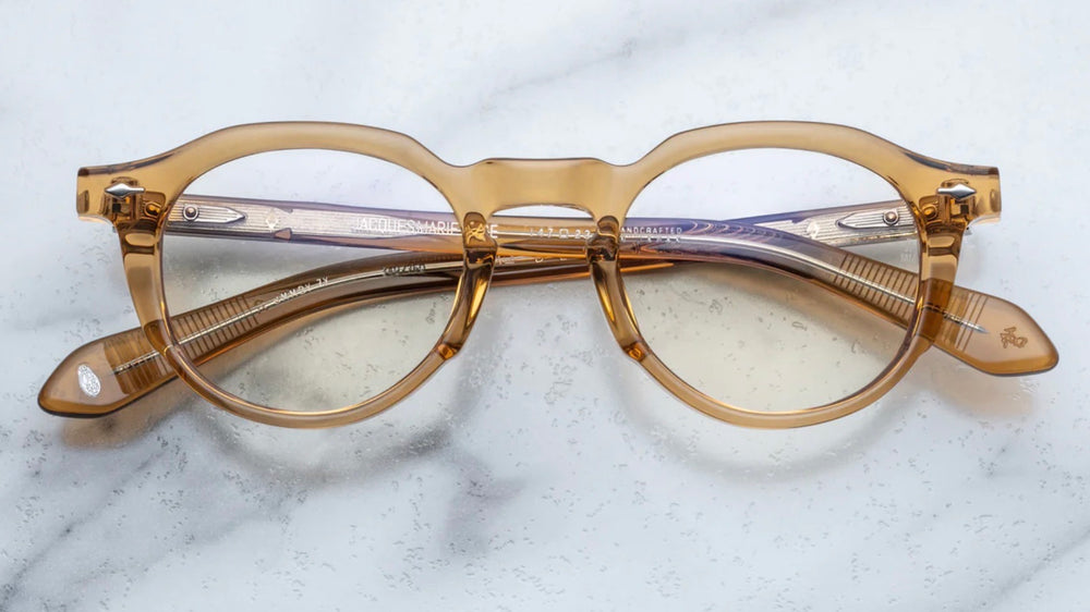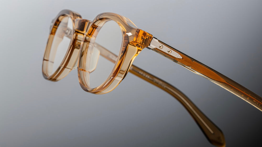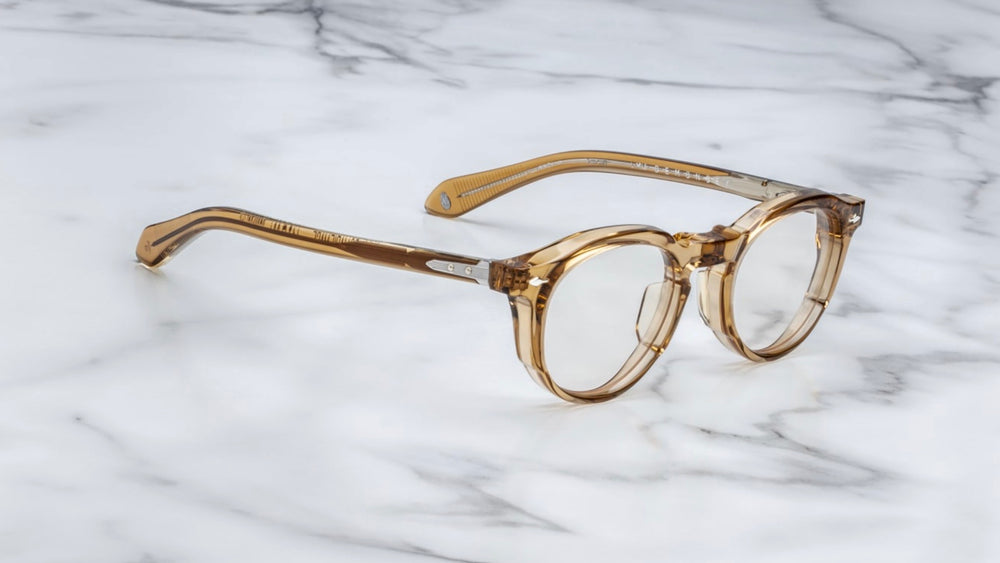 These are sophisticated round-framed glasses with a translucent gold/champagne acetate construction. The frame features a classic pantos shape with a medium-thick build and a refined saddle bridge. The transparent crystal-like finish gives them an elegant, luxurious appearance while maintaining a vintage-inspired aesthetic. The frames construction appears solid yet elegant, with smooth curves and well-balanced proportions typical of high-end eyewear. The overall design suggests a timeless, intellectual style that would suit various face shapes and personal styles.