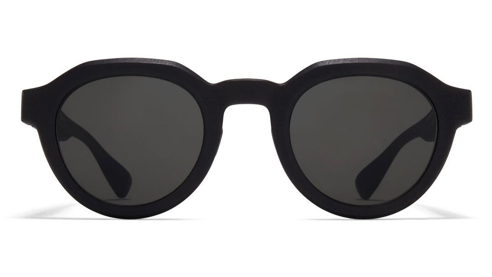 A sleek, contemporary pair of round sunglasses with a bold, matte black frame. The frame features a chunky, substantial build with smooth curves and a minimalist aesthetic. The dark grey lenses are set in a perfectly circular shape, creating a modern, fashion-forward look. The design demonstrates excellent symmetry and balance, with clean lines and a sophisticated silhouette that would complement many face shapes. The temple arms maintain the same substantial thickness as the front frame, creating a cohesive design language throughout.
