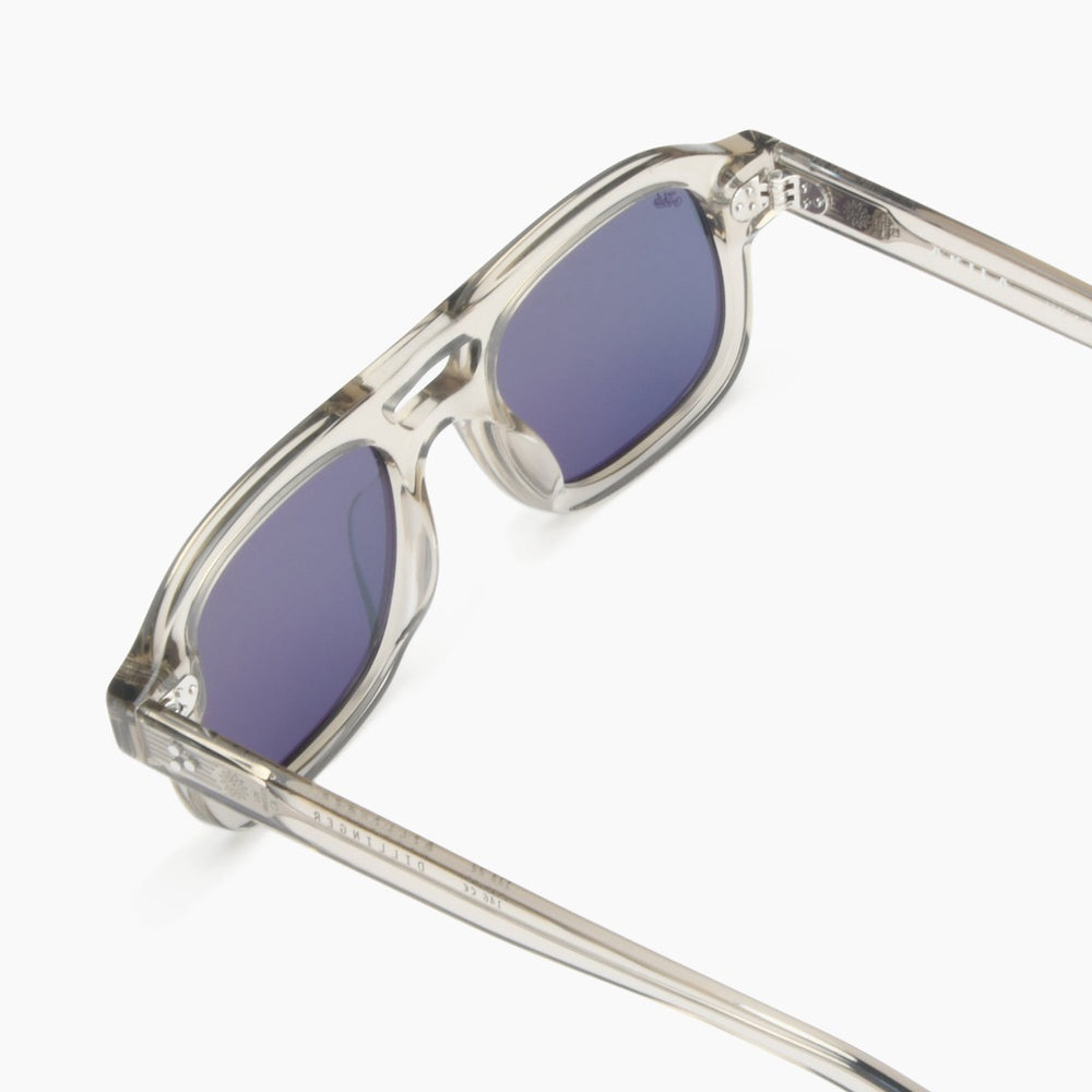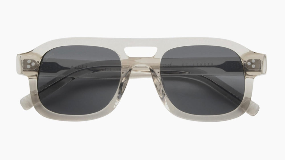 A sophisticated pair of translucent grey sunglasses with a modern, architectural design. The frame features a distinctive double-bridge inspired silhouette with a chunky, contemporary profile. The transparent grey acetate material gives these sunglasses a sleek, minimalist aesthetic while maintaining substantial presence. The grey tinted lenses complement the frame perfectly, creating a cohesive monochromatic look. These sunglasses embody a blend of retro and contemporary styling, making them versatile for various face shapes and personal styles.