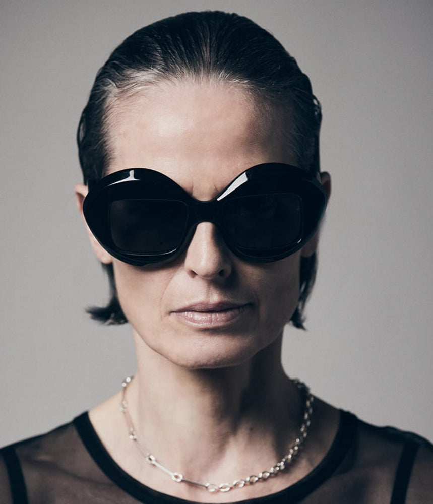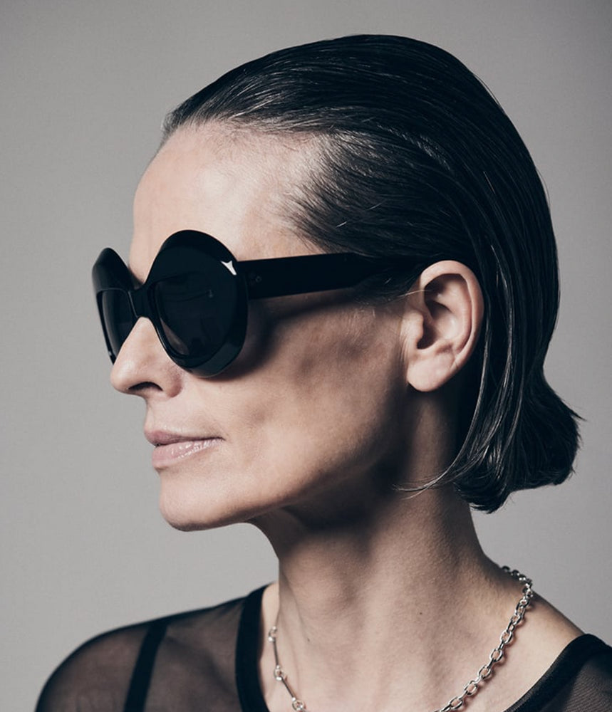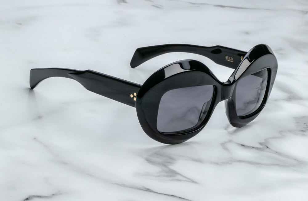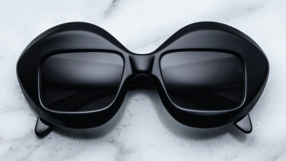 These distinctive oversized sunglasses feature a bold, sculptural silhouette with thick black frames and dark lenses. The design has a glamorous, retro-inspired aesthetic reminiscent of 1960s fashion. The frames have smooth, curved edges and an elegantly swooping top line that creates a dramatic, statement-making look. The chunky temples and substantial frame construction suggest high-quality craftsmanship and durability.