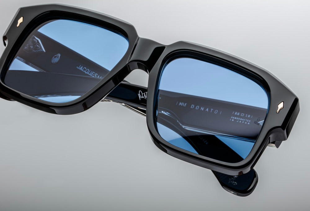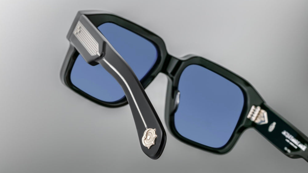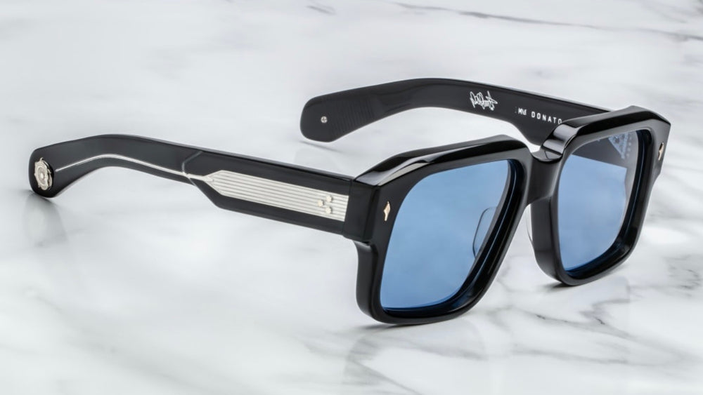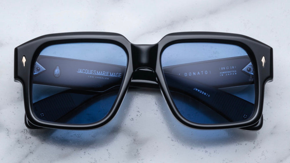 A luxurious oversized square frame sunglasses from Jacques Marie Mage, featuring a bold, chunky acetate construction in glossy black. The frames showcase a distinctive architectural design with strong geometric lines and pronounced angles. The blue-tinted lenses are set within substantial rims, and the piece exhibits premium Japanese craftsmanship with subtle designer branding on the temples. The substantial temple arms complement the bold front design, creating a sophisticated, statement-making aesthetic that combines vintage inspiration with contemporary luxury.