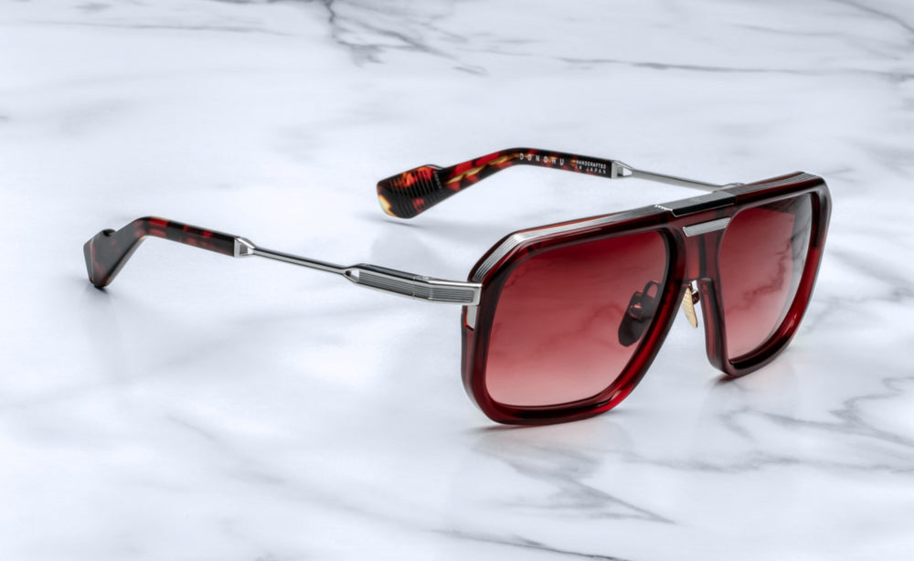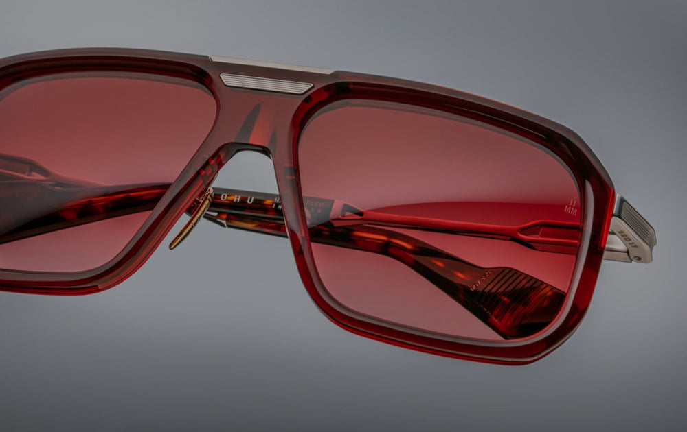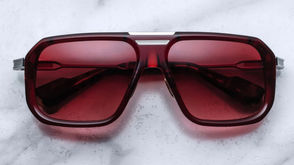 An elegant oversized geometric frame with a bold burgundy-red translucent acetate construction. Features a distinctive flat top design with silver metal accents at the bridge and temples. The sunglasses showcase a luxurious deep red tint in the lenses that complements the frame color. The piece combines vintage inspiration with contemporary styling, creating a sophisticated and statement-making eyewear option. The substantial frame thickness and architectural design elements give it a premium, avant-garde aesthetic.