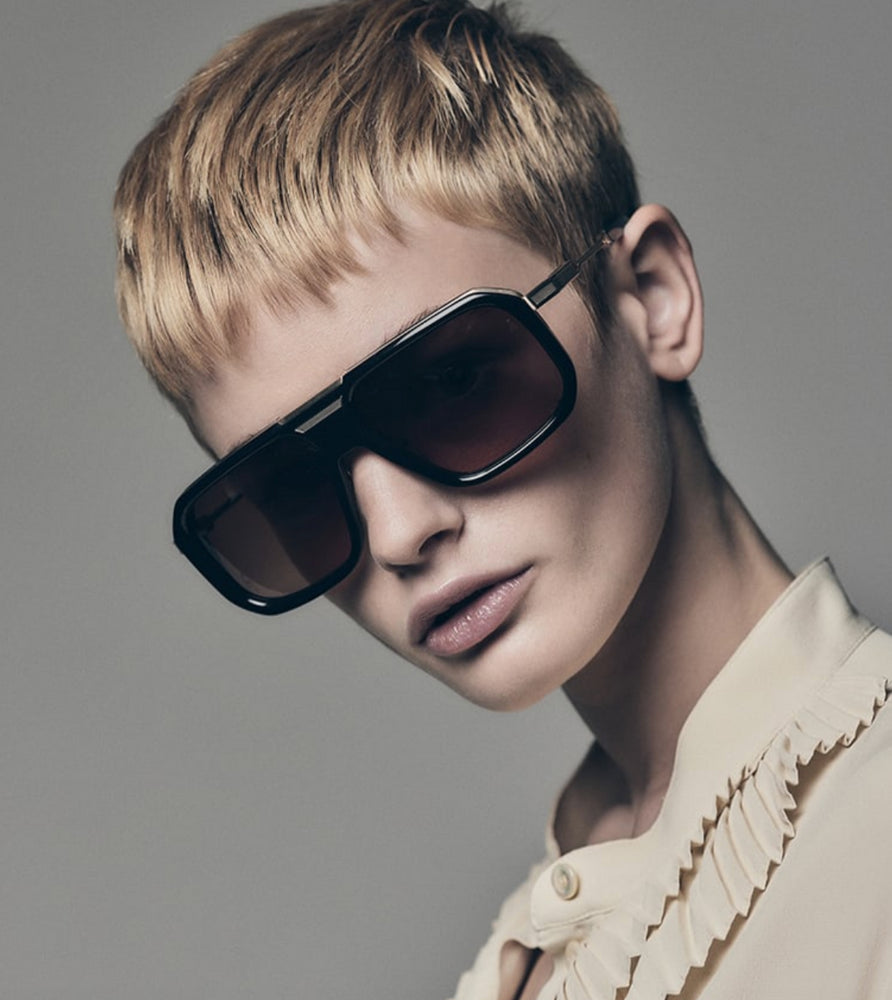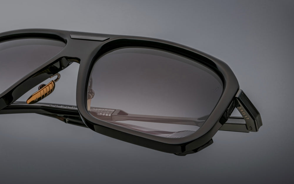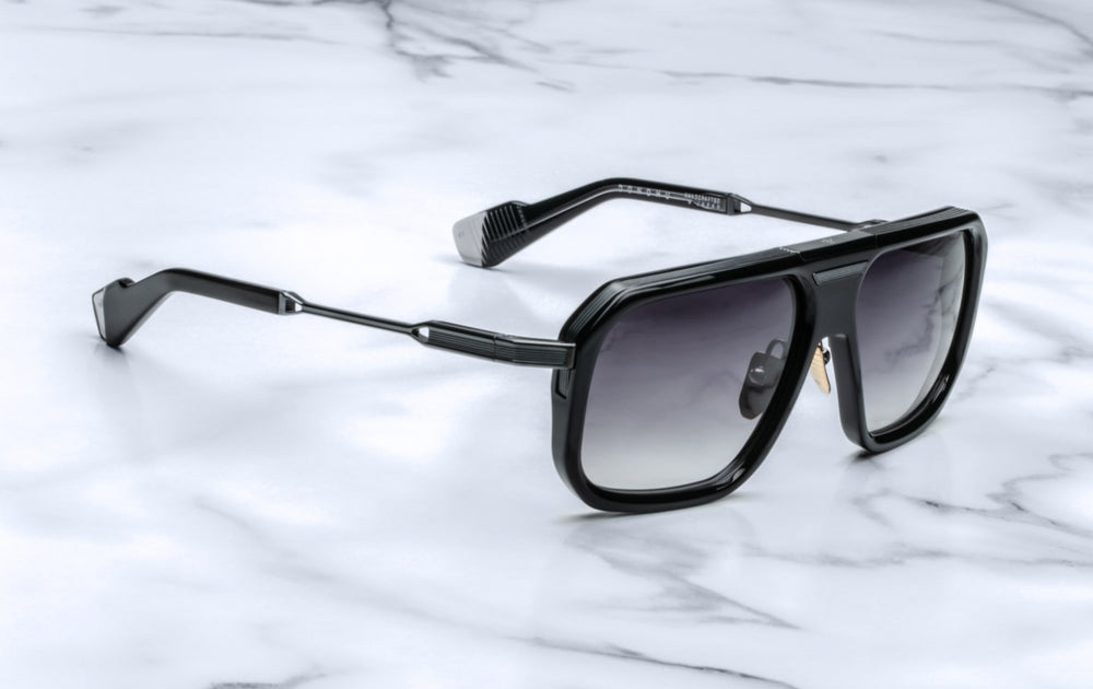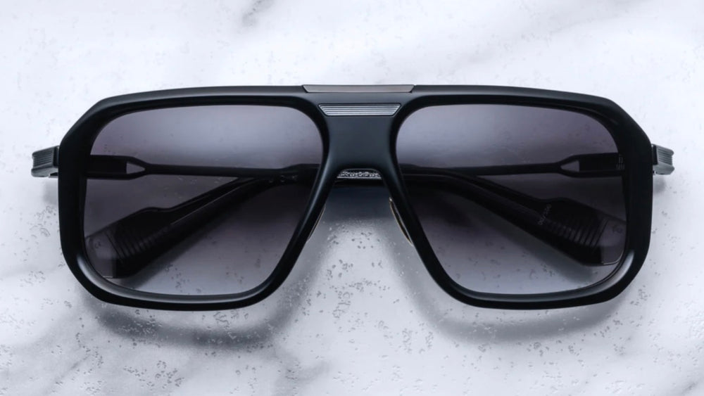 A sophisticated pair of oversized aviator sunglasses with a bold, masculine design. The frame features a distinctive thick plastic construction with a modern interpretation of the classic aviator silhouette. The sunglasses showcase a sleek matte black finish throughout, with gradient grey lenses that add to their contemporary appeal. The design includes subtle metallic accents and architectural details on the bridge and temples, demonstrating premium craftsmanship. The substantial frame thickness and pronounced brow bar create a strong, commanding presence typical of luxury eyewear.