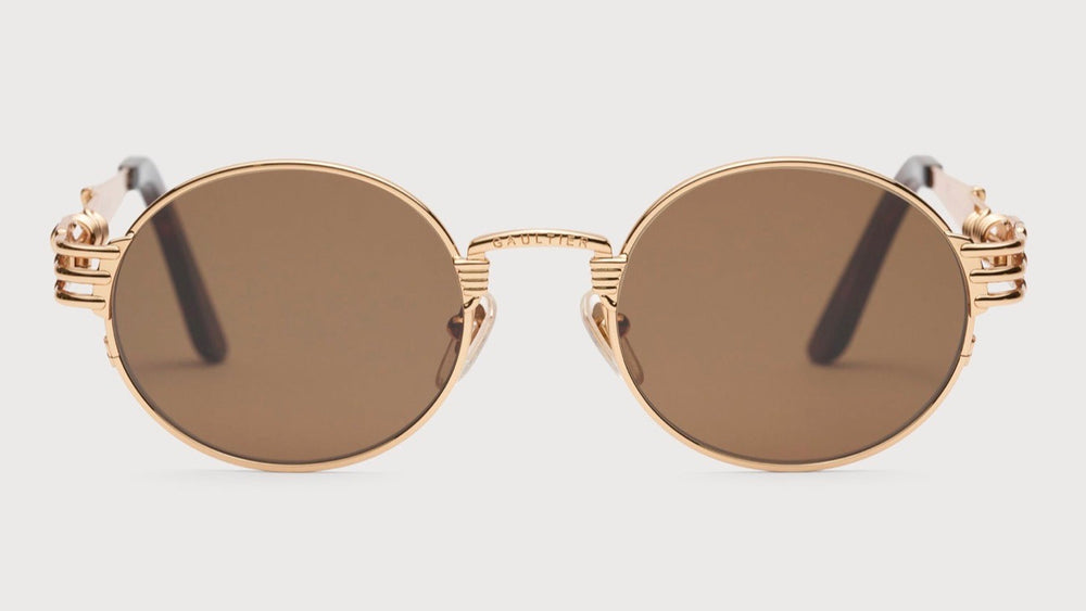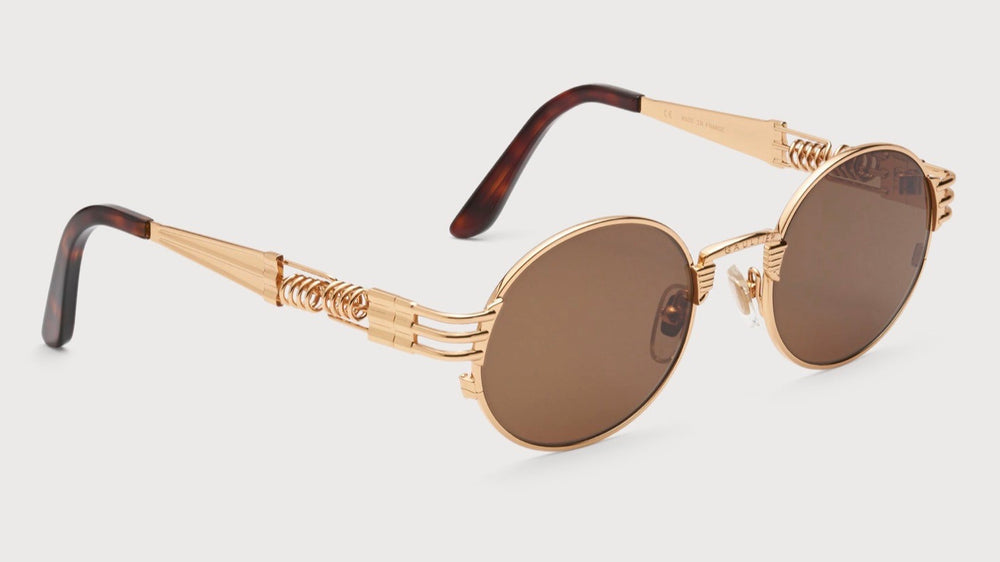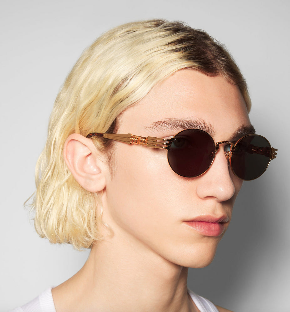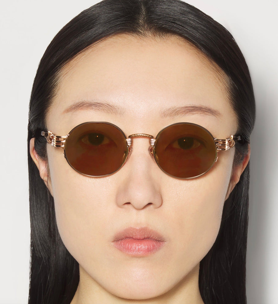 Distinctive vintage-inspired round sunglasses with an elegant gold-tone metal frame. Features unique decorative side detailing with multiple parallel bars creating a sophisticated steampunk aesthetic. The frame has a delicate construction with thin rims and temple arms, complemented by brown-tinted lenses. The design beautifully balances retro and luxury elements with its ornate temple detailing and minimalist circular shape.
