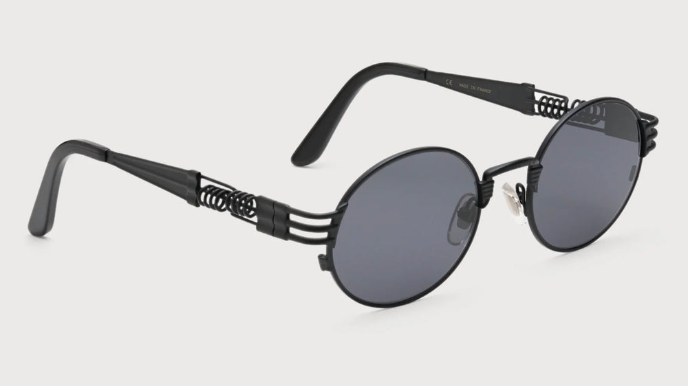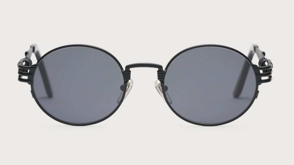 Distinctive vintage-inspired round sunglasses with a steampunk aesthetic featuring a double bridge design and decorative spring mechanisms on the temples. The frame has an industrial look with intricate metalwork details, particularly on the side temples which showcase unique mechanical-style elements. The all-black metal construction gives it a sophisticated, edgy appearance, while the grey lenses complete the classic look. The sunglasses exhibit expert craftsmanship with precise metalwork and architectural details that are characteristic of high-end designer eyewear.