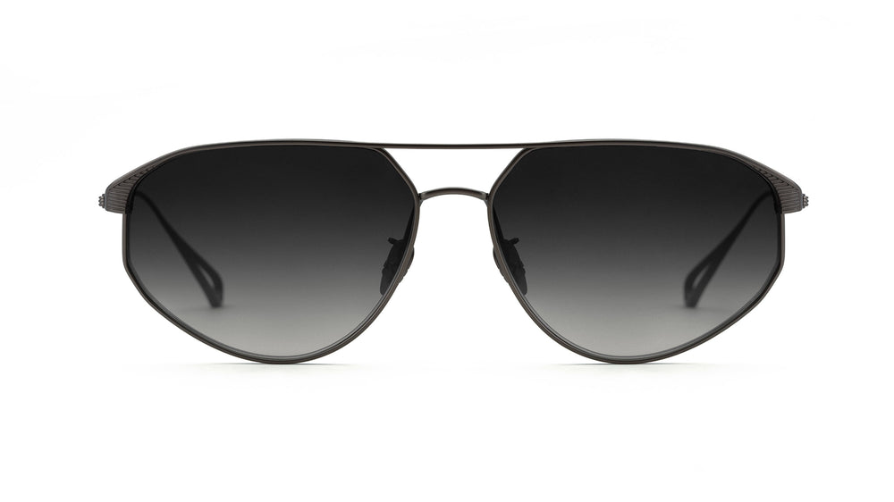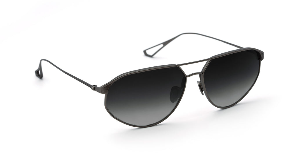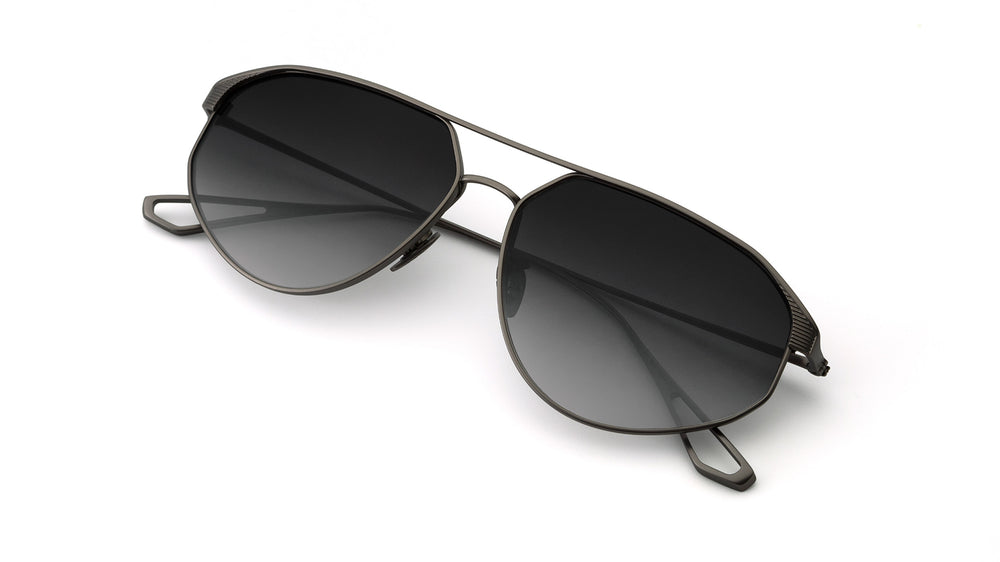These sleek aviator sunglasses feature a gunmetal grey frame with a sophisticated gradient lens treatment. The design maintains a classic aviator silhouette with modern refinements, including textured detailing on the temple arms. The double bridge and adjustable nose pads ensure a comfortable fit, while the gradient lenses transition smoothly from dark to light. The overall aesthetic is minimalist and contemporary, making these sunglasses suitable for both casual and formal occasions.