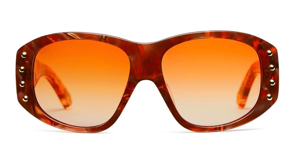 Striking oversized geometric sunglasses with a luxurious tortoiseshell acetate frame. Features gradient orange-tinted lenses and decorative metal studs along the frame edges. The substantial frame thickness and bold silhouette create a glamorous, retro-inspired look. The glasses showcase a seamless saddle bridge and coordinating tortoise temple arms for a cohesive design. The oversized shape provides excellent sun protection while making a bold fashion statement.