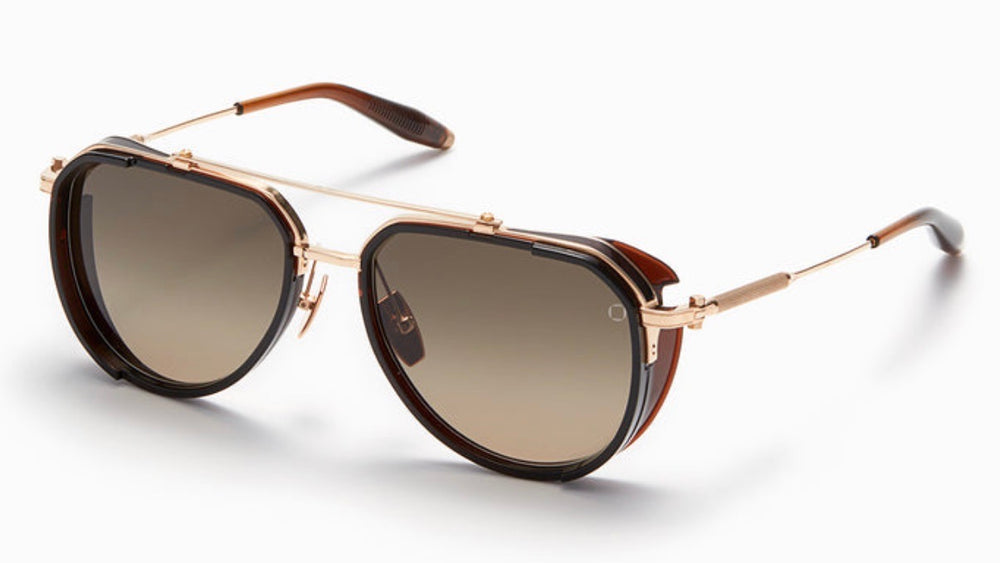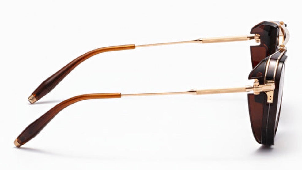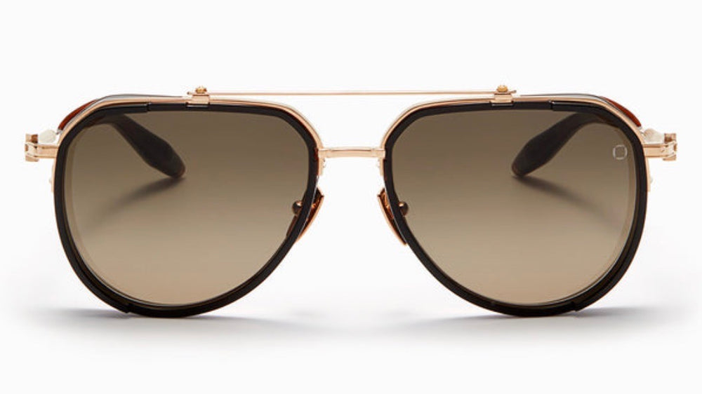 Luxurious aviator-style sunglasses featuring a sophisticated black and gold color scheme. The frames combine a black acetate rim with polished gold metal detailing, creating an elegant contrast. The double bridge design adds a classic touch, while the gradient brown lenses provide stylish sun protection. The sunglasses showcase fine craftsmanship with detailed hinges and sophisticated temple arms in matching gold finish. The overall design strikes a perfect balance between vintage inspiration and modern luxury, making it suitable for both casual and formal occasions.