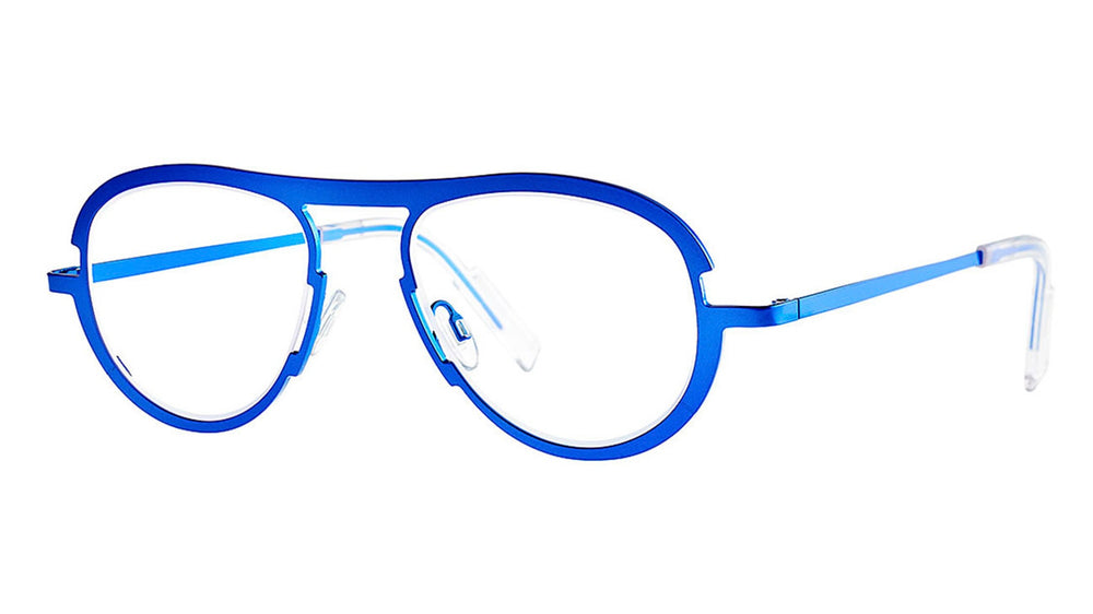 Modern aviator-style glasses with a striking electric blue metal frame throughout. The design features clean lines with a contemporary twist on the classic aviator shape. The frame has a sleek, architectural quality with smooth transitions between components. The temple arms maintain the same vibrant blue color and appear to have a minimalist, straightforward design. The overall aesthetic is bold yet sophisticated, perfect for fashion-forward professionals seeking a statement piece that remains wearable for everyday use.
