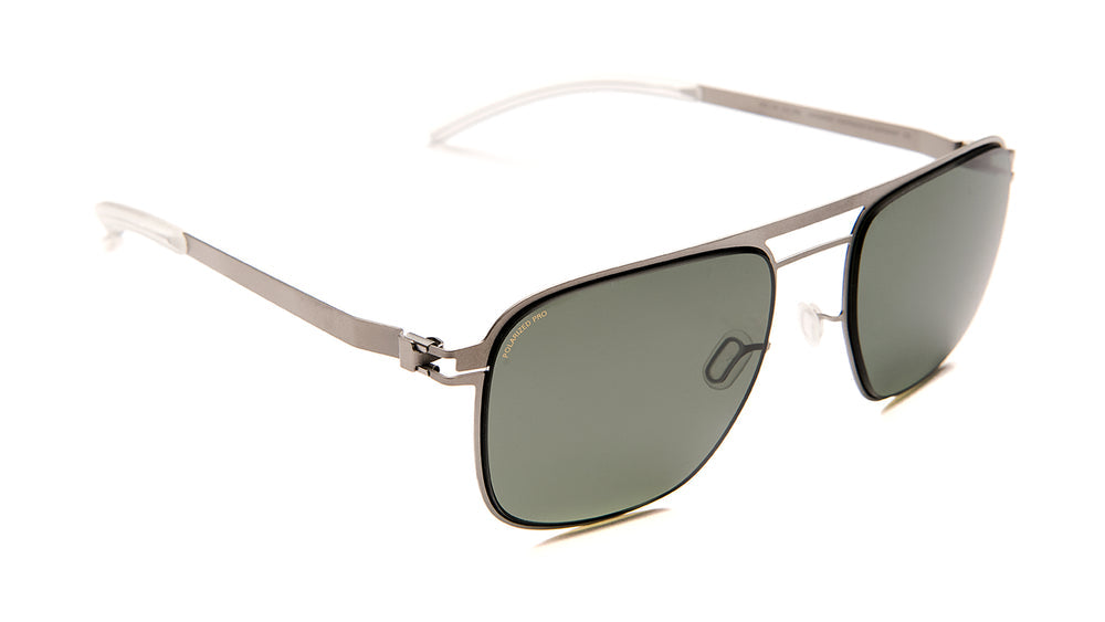 These sleek aviator-style sunglasses feature a minimalist design with a modern twist. The frame has a sophisticated gunmetal grey finish with clean lines and architectural details. The double bridge and angular lens shape create a contemporary take on the classic aviator silhouette. The lenses are a deep forest green, offering excellent sun protection while maintaining a professional appearance. The slim profile and subtle metallic finish make these sunglasses both elegant and versatile for everyday wear.