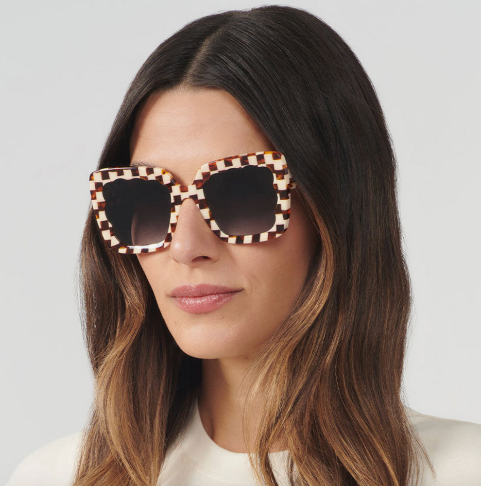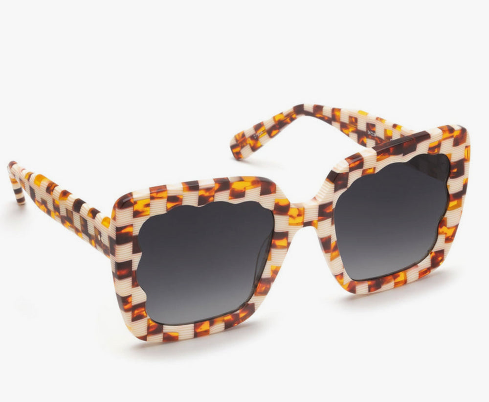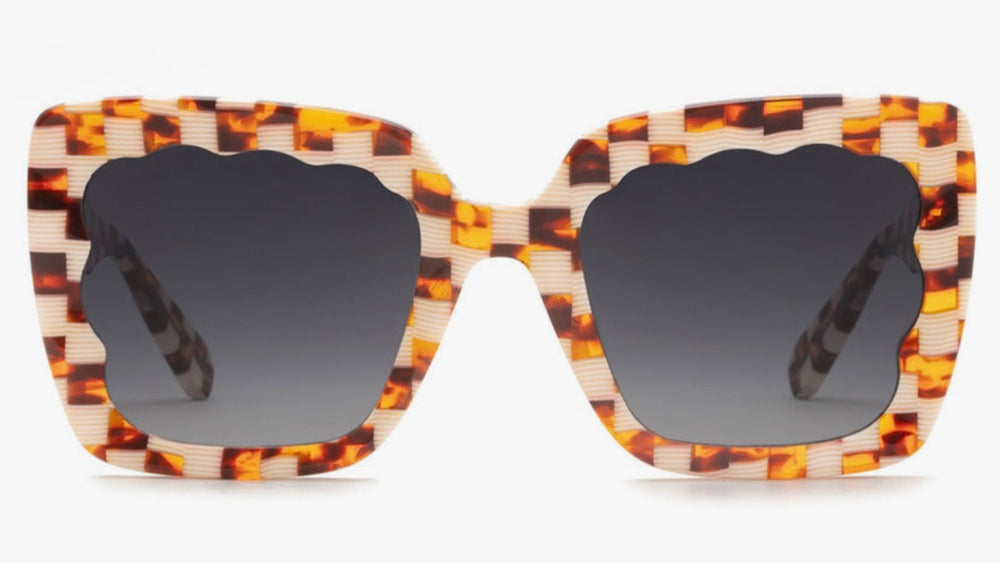 These are bold, oversized square sunglasses featuring a striking tortoiseshell pattern in cream and amber tones on the frames. The gradient grey lenses provide elegant contrast against the patterned frames. The sunglasses showcase a distinctive geometric silhouette with thick rims and temple arms, creating a luxurious, statement-making accessory. The pattern appears to have a unique ribbed or textured effect in the acetate, adding depth and sophistication to the design.