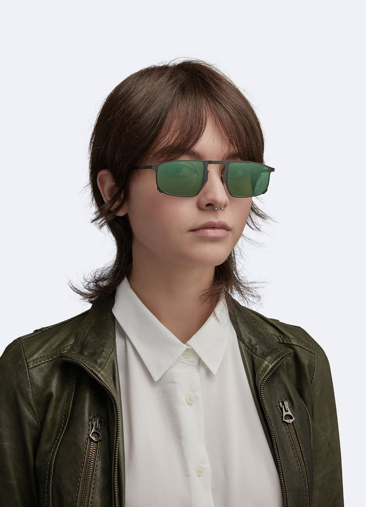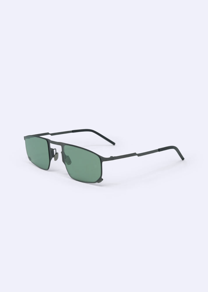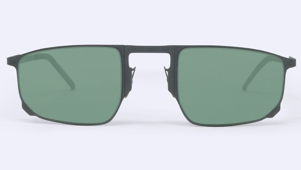 Sleek and modern rectangular sunglasses with a minimalist metal frame in matte black. The design features a contemporary flat top bar and streamlined temple arms. The green-tinted lenses create a sophisticated look while providing sun protection. The thin profile and architectural lines give these sunglasses a professional, understated appeal suitable for both casual and formal wear. The nose pads appear adjustable for custom fit, and the overall construction suggests durability despite its lightweight appearance.