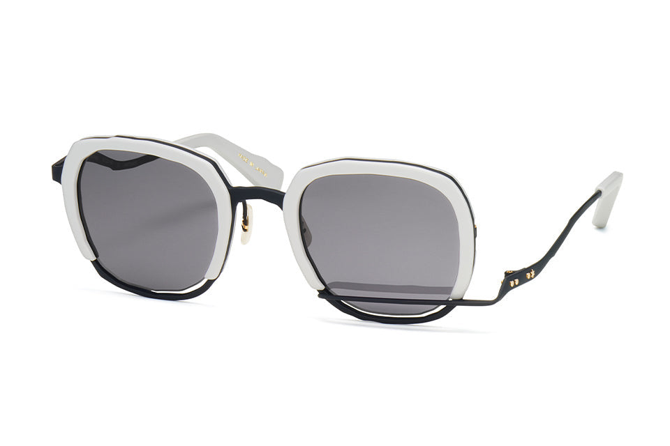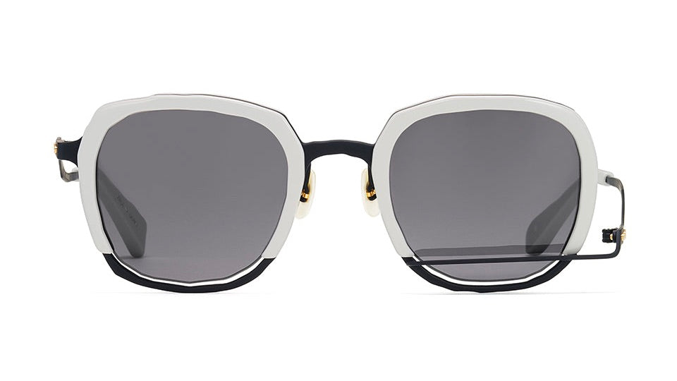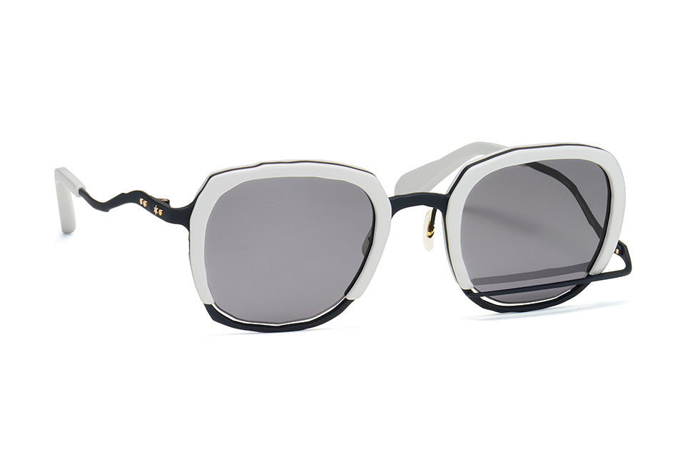 Modern avant-garde sunglasses featuring a striking geometric design with a white outer frame and black inner frame creating a floating effect. The design incorporates unique architectural elements with clean lines and a minimalist double-layered construction. The frame combines angular and curved elements in an artistic way, showcasing Japanese design aesthetics. The grey mirrored lenses are housed within an innovative frame structure that appears to float within the outer frame boundary, creating a sophisticated dimensional effect.