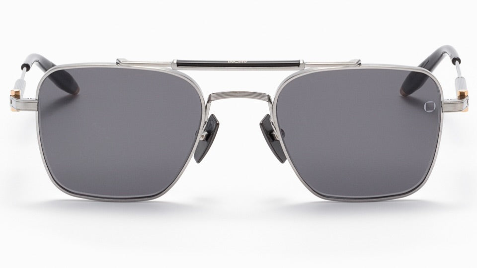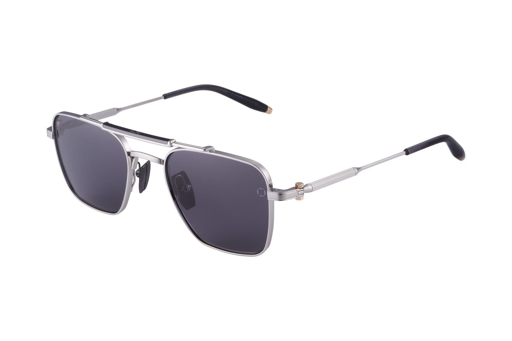 These are premium aviator-inspired square sunglasses with a sophisticated double-bridge design. The frame features a sleek silver metallic finish with a contemporary angular shape. The grey-tinted lenses are complemented by slim temple arms with textured end pieces for comfort. The design incorporates adjustable nose pads and has a refined, architectural quality that suggests luxury and precision craftsmanship. The sunglasses have a modern, masculine aesthetic with clean lines and professional styling.