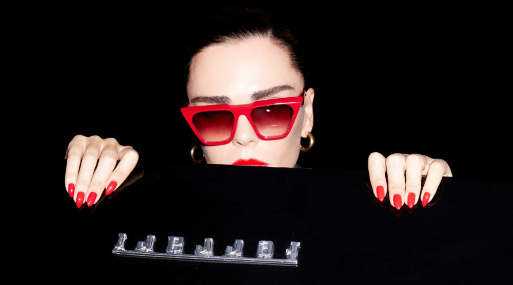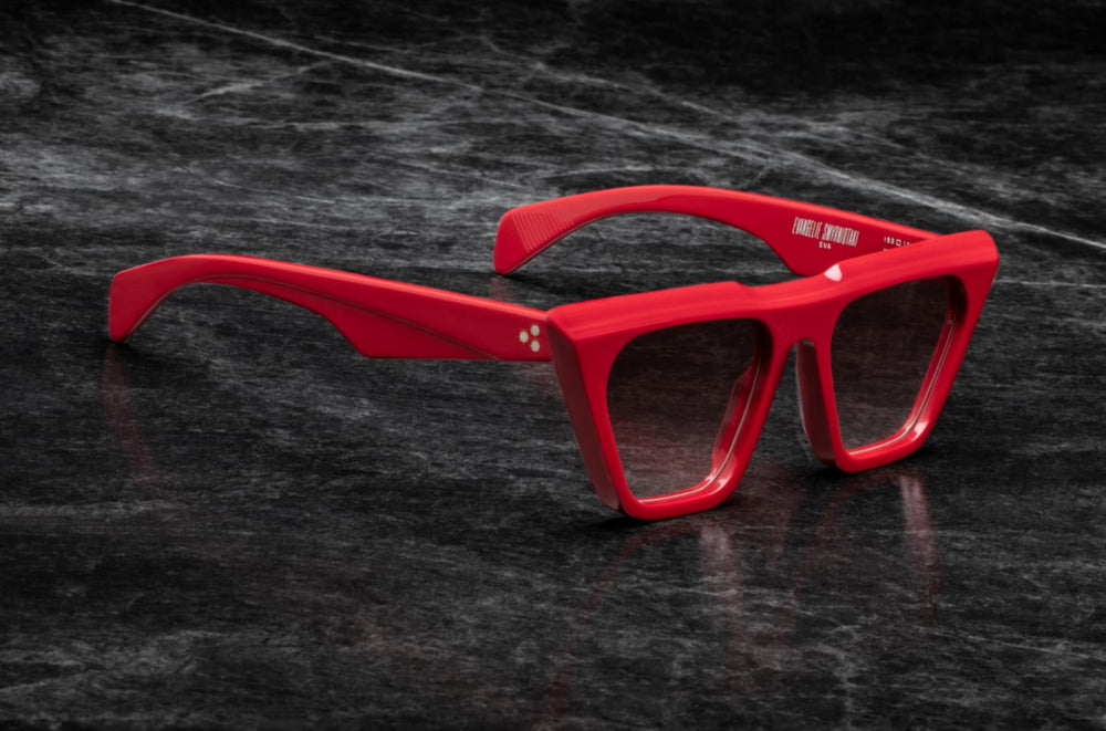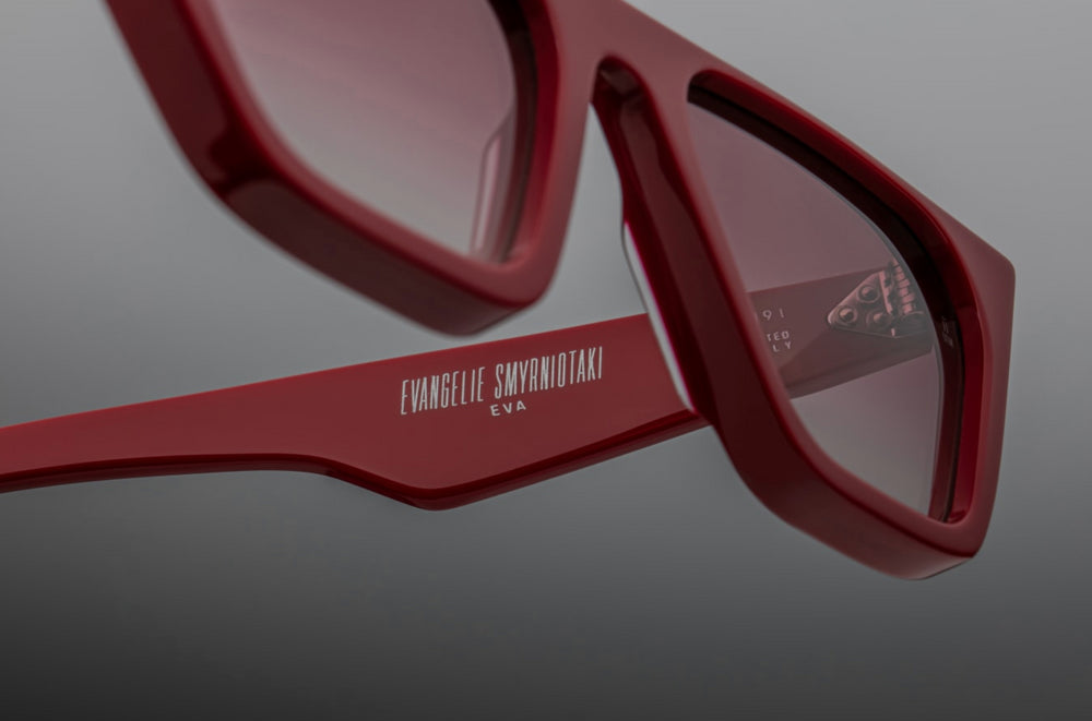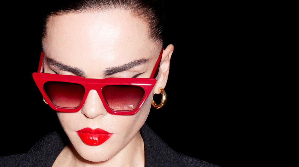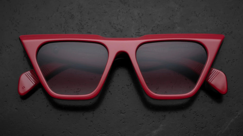 A striking red cat-eye frame with dramatic angular edges and bold geometric lines. The sunglasses feature a contemporary interpretation of the classic cat-eye silhouette with a pronounced upward sweep at the temples. The matte red finish gives these frames a sophisticated, modern look, while the dark lenses provide excellent contrast. The temples are substantial and match the frames color, creating a cohesive design. These sunglasses embody luxury vintage aesthetics with a modern twist.