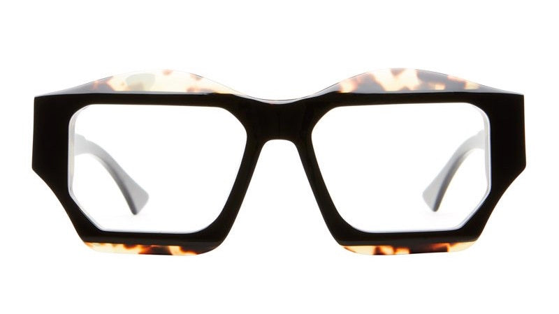 Bold geometric frames featuring a thick black acetate front with tortoiseshell accents along the top rim and temple tips. The oversized angular shape creates a striking avant-garde aesthetic. The frame has a pronounced angular brow line and dramatic squared-off corners, making it a statement piece with architectural appeal. The clear lenses and substantial construction give it a modern, artistic quality suitable for those seeking distinctive eyewear.