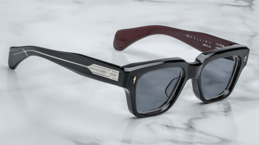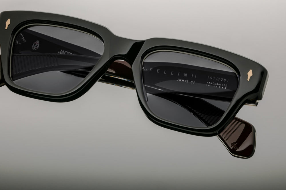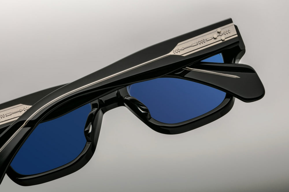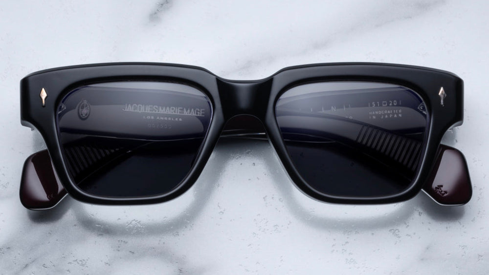These are luxurious, bold JACQUES MARIE MAGE sunglasses featuring an imposing square silhouette with thick, glossy black acetate frames. The design showcases distinctive diamond-shaped metal accents on the front corners, giving them a sophisticated vintage-inspired look. The sunglasses have a substantial presence with their thick frame construction and dark lenses, embodying a classic yet statement-making aesthetic thats characteristic of high-end eyewear.