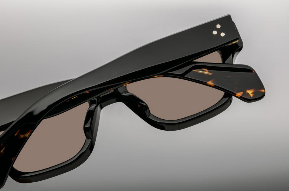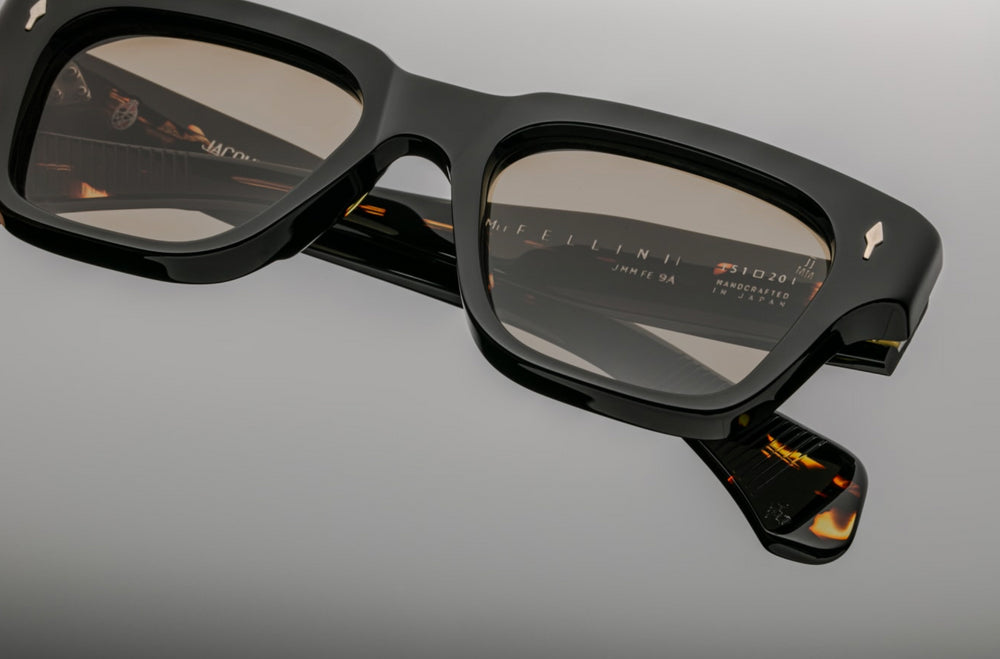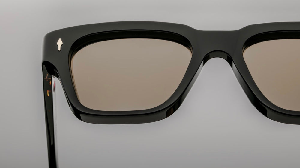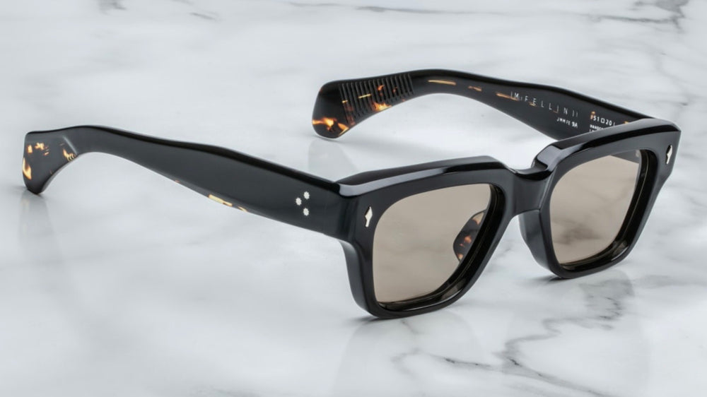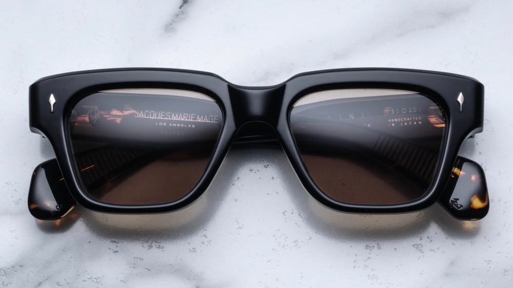 These luxury JACQUES MARIE MAGE sunglasses feature a bold, chunky square frame design with a glossy black acetate construction. The substantial frame thickness creates a striking architectural presence. The lenses are a rich brown tint offering full UV protection. The design showcases classic proportions with a sophisticated vintage-inspired aesthetic, handcrafted in Japan with meticulous attention to detail. Small diamond-shaped metal accents on the front corners add a subtle decorative touch.