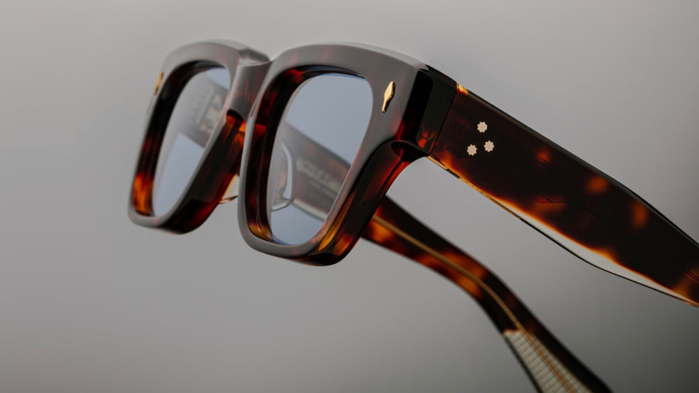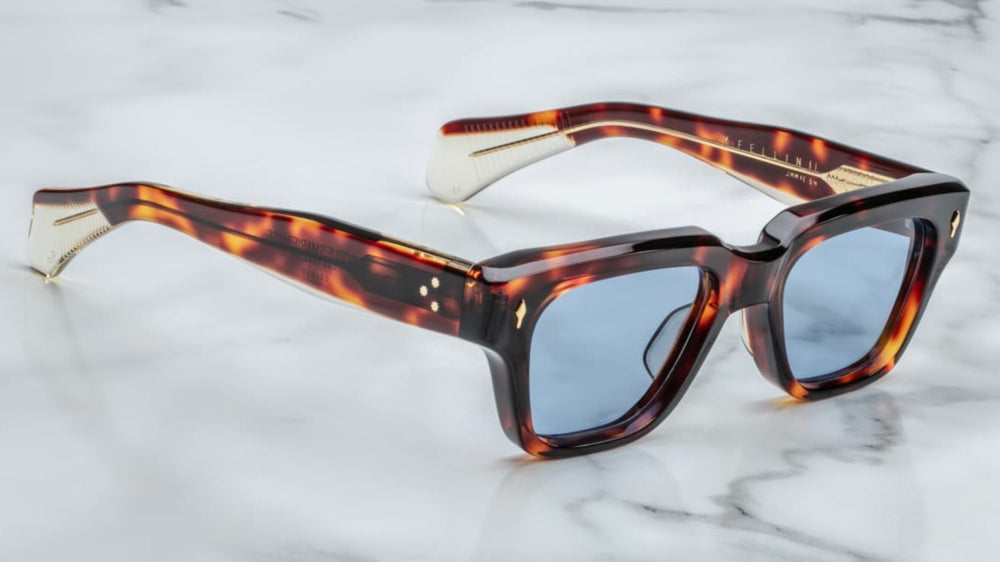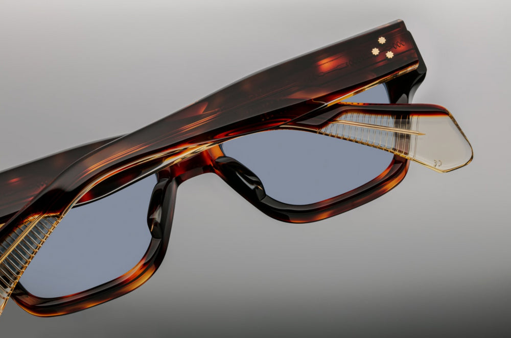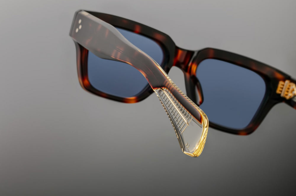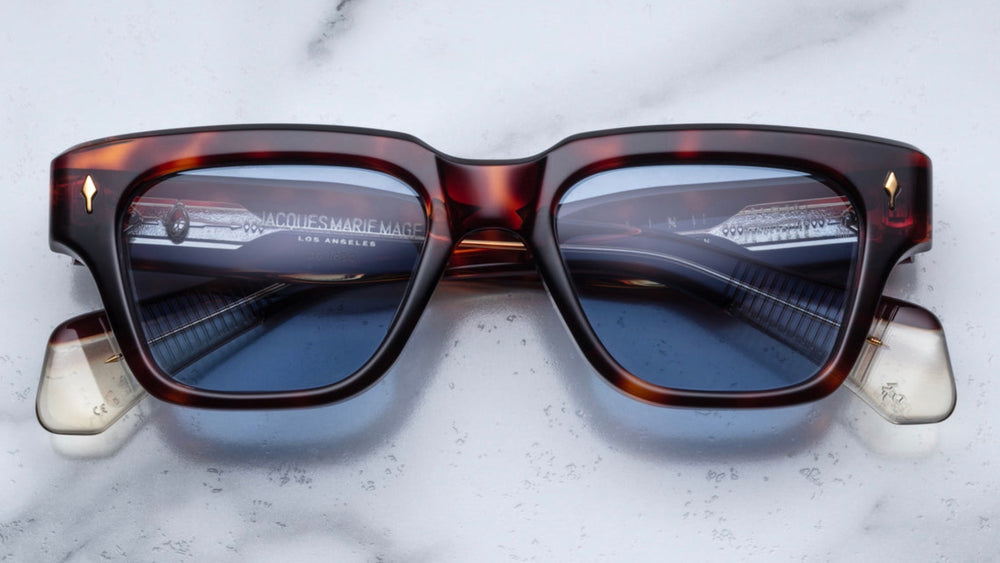 A luxurious pair of Jacques Marie Mage thick-framed sunglasses in a rich tortoiseshell acetate with blue-tinted lenses. The frames feature a bold, architectural square silhouette with distinctive diamond-shaped metal accents on the front corners. The design showcases substantial temple arms and a prominent saddle bridge, embodying a vintage-inspired yet contemporary aesthetic. These statement sunglasses exhibit exceptional craftsmanship with their high-quality acetate construction and refined finishing details.