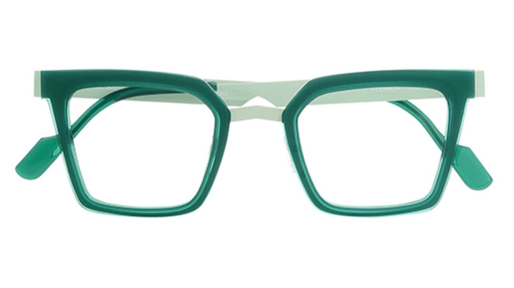 Modern geometric frames with a bold angular squared-off shape featuring an eye-catching emerald green color throughout. The design has clean architectural lines with sharp corners and a contemporary aesthetic. The medium-thick frame construction provides durability while maintaining a sleek profile. The monochromatic green coloring on the front frame, temples and bridge creates a cohesive, striking look that makes a confident style statement.
