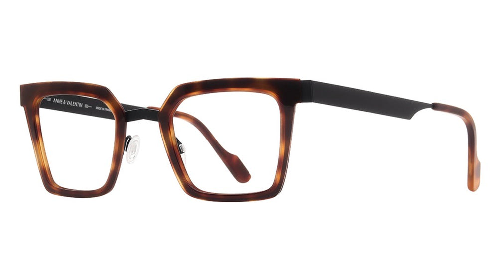 Modern geometric frames featuring a distinctive angular tortoiseshell front with black metal accents. The design showcases a contemporary square-geometric silhouette with luxurious tortoise acetate, complemented by sleek black metal temple arms and bridge. The architectural styling combines vintage and modern elements for a sophisticated, intellectual look suitable for creative professionals.